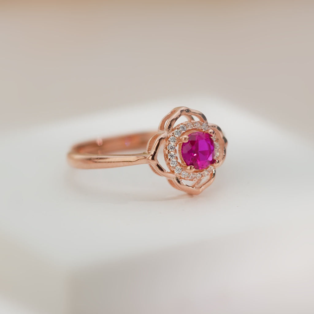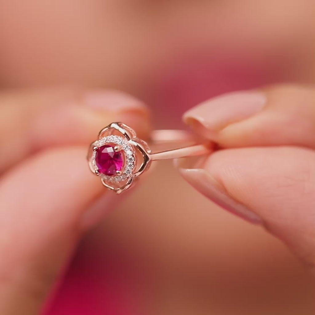 Made in 925 sterling silver with rose-gold plating, the ring features a ruby-red central stone framed by a halo of white CZ. Its petal-inspired frame adds a romantic, timeless charm.