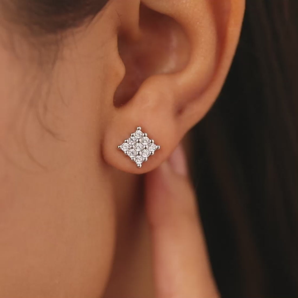 Crafted in 925 sterling silver with rhodium plating, the earrings feature a geometric cluster of round CZ stones in a starry formation. With push-back closures, they’re elegant, modern, and ideal for daily or festive wear.