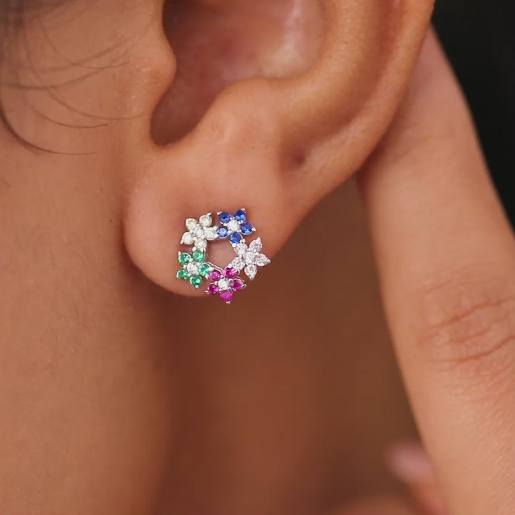 Crafted in 925 sterling silver with rhodium plating, the earrings feature floral motifs set with multicolour CZ stones. With secure push-back closures, they are lightweight and perfect for playful sparkle in everyday looks.