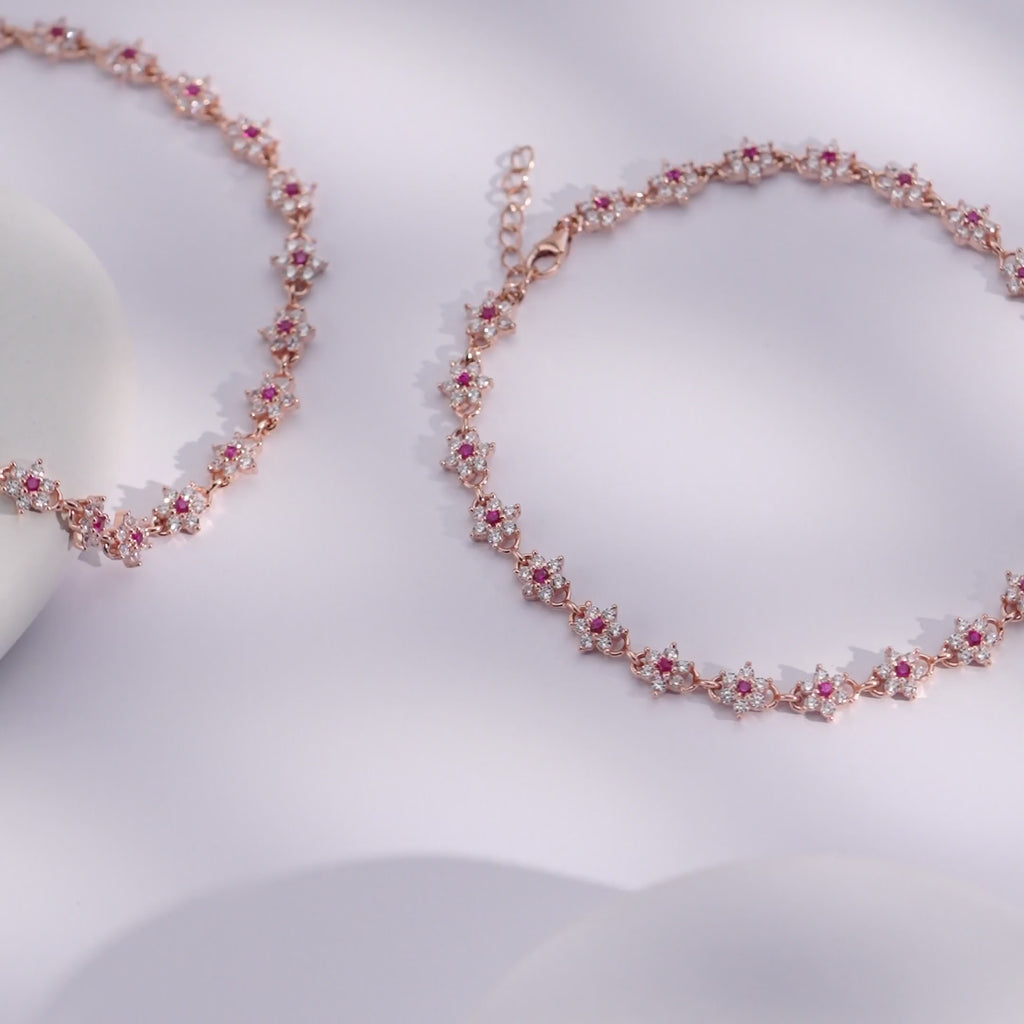 Product Description:- Adorn your ankle with the delicate beauty of our Floral Charm anklet. Made from 925 sterling silver and elegantly plated with rose gold, this anklet features petite floral accents adorned with sparkling cubic zirconia. Its adjustable length ensures a comfortable fit, making it suitable for any occasion, from casual outings to special events. Embrace the grace of nature with this enchanting piece that celebrates both elegance and simplicity. The Floral Charm Rose Gold-Plated 925 Sterling Silver Anklet is a timeless accessory to elevate your style.
