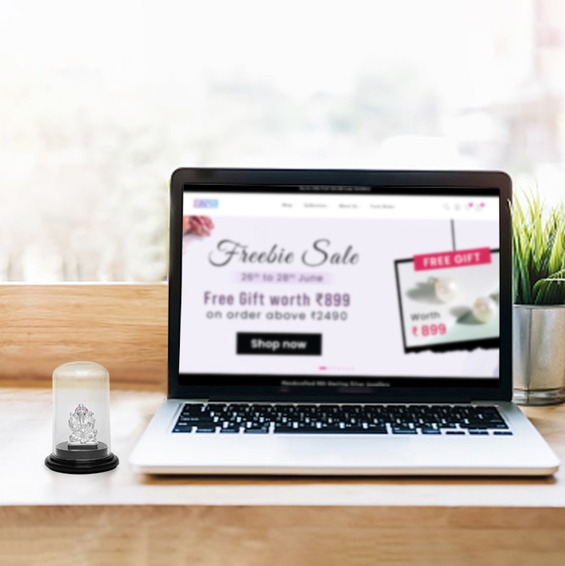 Product Description:- Experience divine tranquility with the Sacred Serenity Rhodium-Plated Sterling Silver Ganesh Idol. Crafted with meticulous attention to detail, this exquisite idol showcases the iconic Lord Ganesh in all his majestic glory. The rhodium plating adds a touch of elegance and durability to the sterling silver, ensuring its lasting beauty. Place this sacred idol in your home or office to invite blessings, wisdom, and prosperity into your life. With its serene presence and intricate craftsmanship, the Sacred Serenity Ganesh Idol is a true symbol of devotion and spirituality.