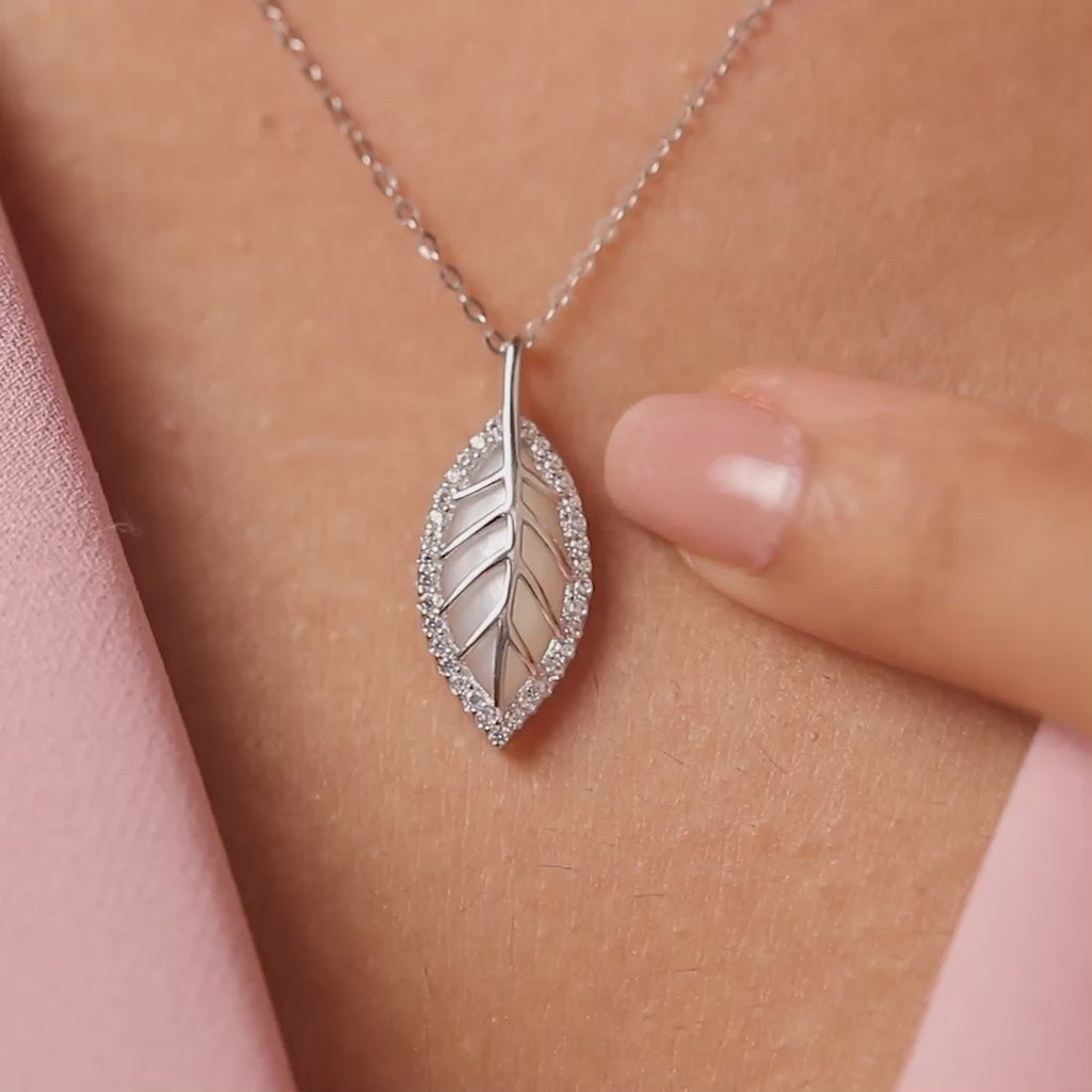 Crafted in rhodium-plated 925 sterling silver, the necklace pairs a delicate leaf motif with pearl and CZ accents. Adjustable with lobster clasp.