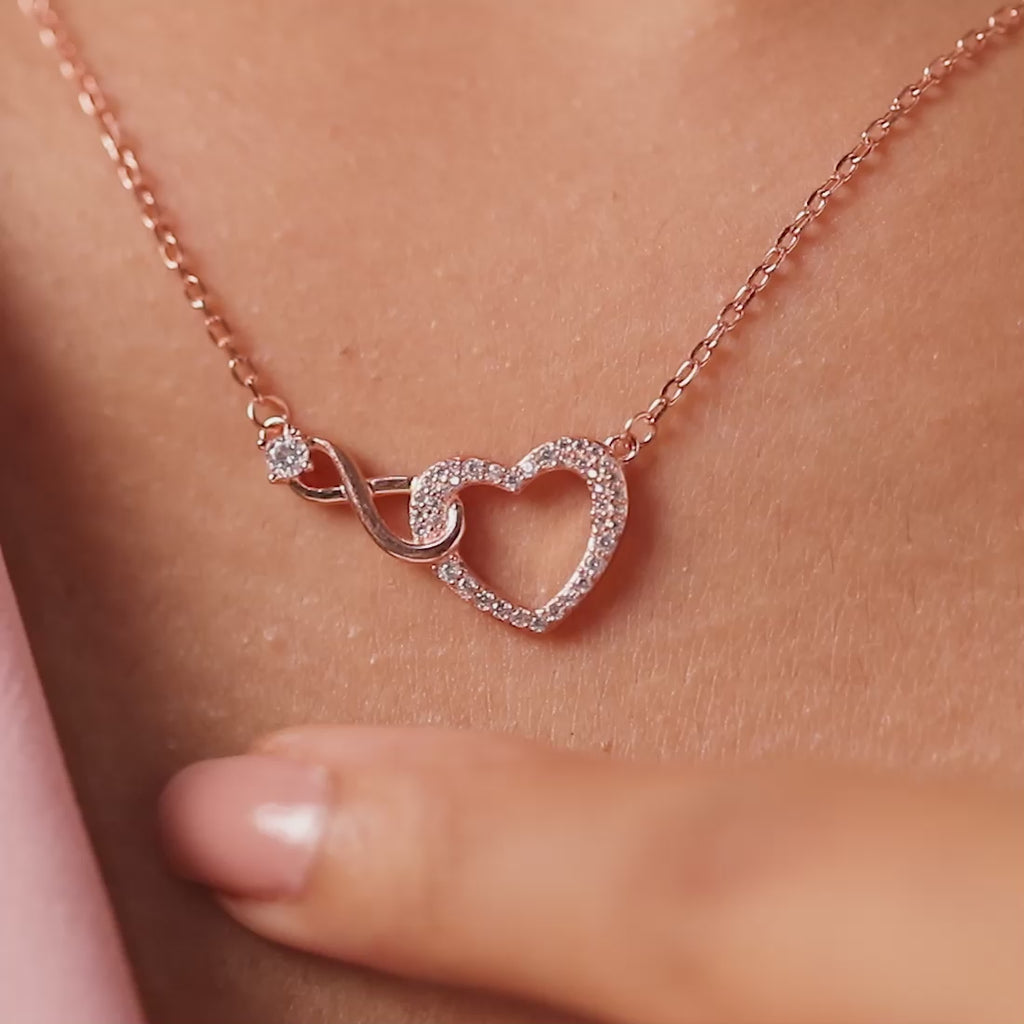Crafted in rose-gold plated 925 sterling silver, the pendant features an infinity-heart motif set with sparkling CZ stones. Adjustable with lobster clasp.