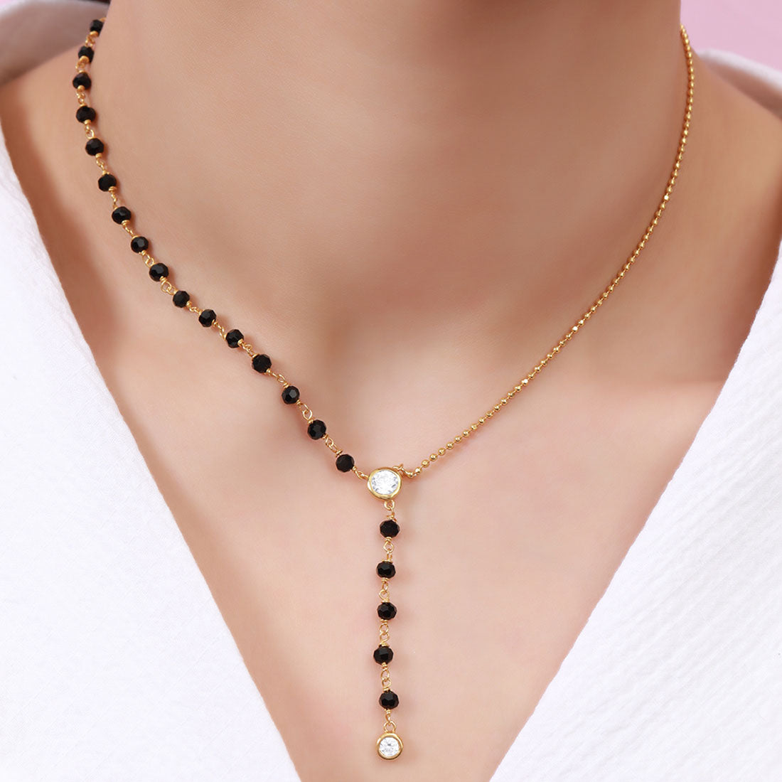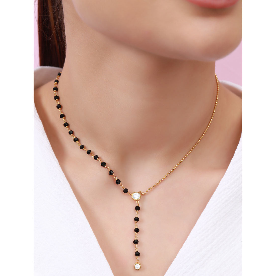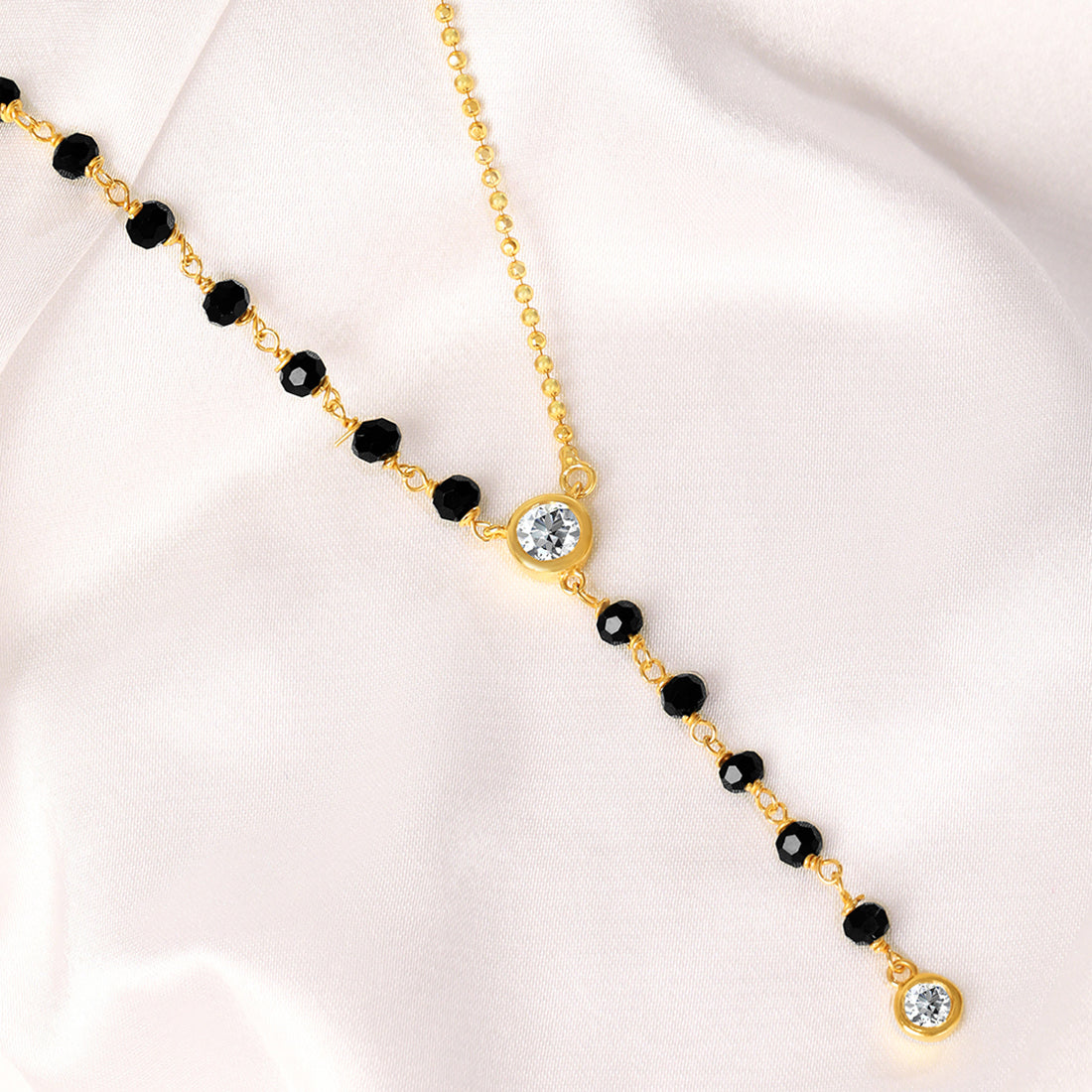 Product Description:- Celebrate the eternal bond of love with this elegant mangalsutra. Crafted from high-quality 925 sterling silver and plated with gleaming gold, this mangalsutra features a captivating asymmetrical design with a black bead chain and a delicate pendant adorned with sparkling cubic zirconia stones.