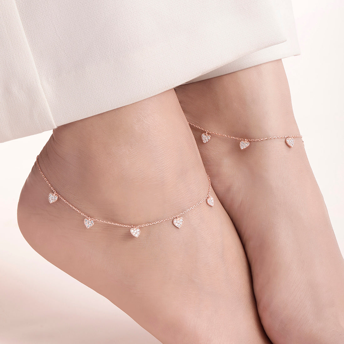 Product Description:- Crafted from premium 925 sterling silver with a sleek rose gold plating, this anklet features heart shapes adorned with dazzling cubic zirconia stones. Symbolizing protection and positivity, it’s a meaningful piece that blends style with purpose. Perfect for daily wear or special occasions, this anklet adds a subtle touch of sophistication to any outfit, making it a cherished addition to your jewelry collection.