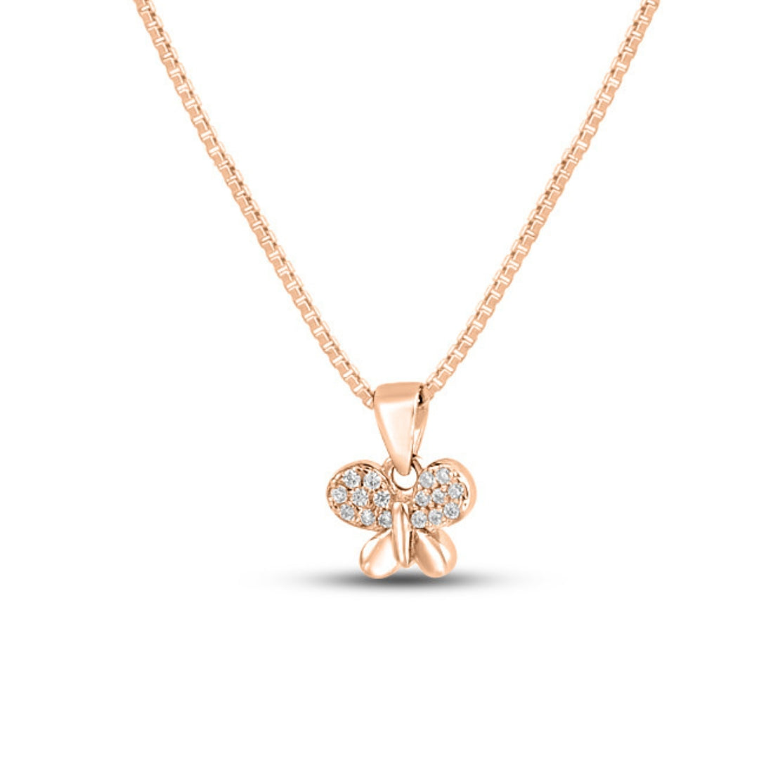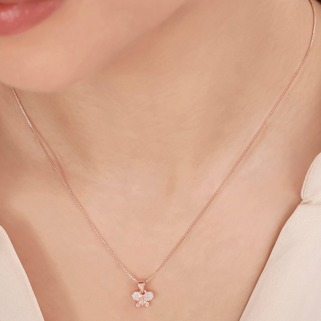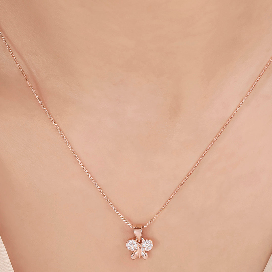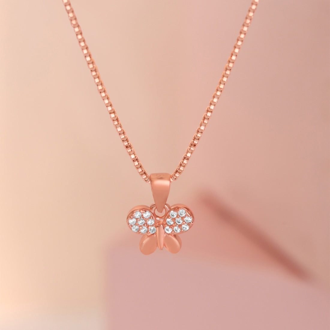 Product Description:- Crafted from high-quality 925 sterling silver and elegantly plated with rose gold, these minimalist butterfly pendants offer a delicate and refined design. Embellished with subtle cubic zirconia accents, they bring a touch of sparkle to the graceful butterfly motif. Perfect for adding a gentle, feminine charm to any ensemble, these pendants are ideal for both casual and special occasions.
