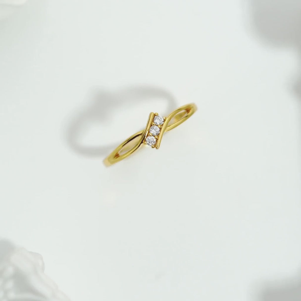 Crafted in 925 sterling silver with gold plating, the ring features a sleek band crossed in a flowing infinity design. Three brilliant CZ stones sit at the center, adding sparkle that symbolizes eternal commitment.