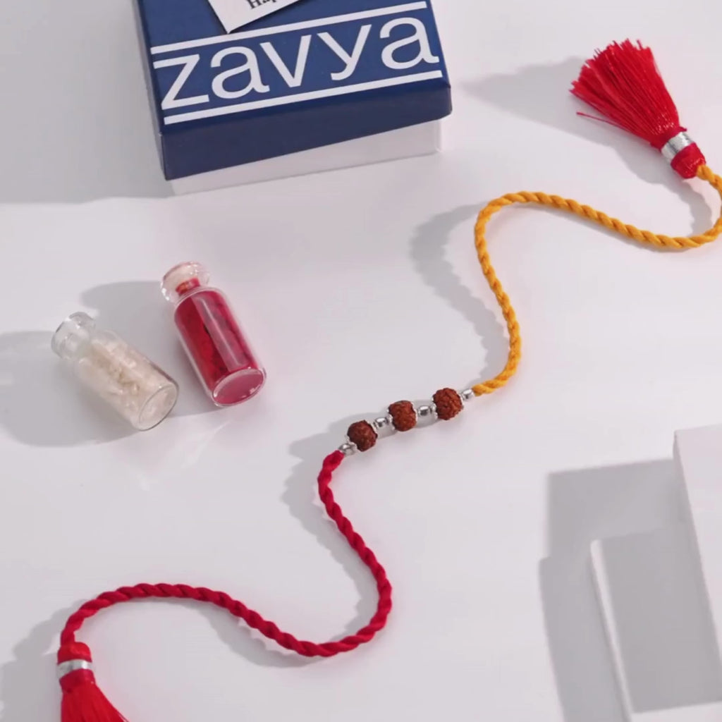 Product Description:- Embrace the divine blessings with our Divine Rudraksha Rhodium-Plated 925 Sterling Silver Rakhi. This sacred rakhi features authentic Rudraksha beads set in a rhodium-plated 925 sterling silver design. The intricate craftsmanship and spiritual significance of the Rudraksha beads make this rakhi truly special. Express your love and protect your bond with the divine energy of this exquisite rakhi. Perfect for celebrating the auspicious occasion of Raksha Bandhan, this rakhi will adorn the wrist of your beloved brother with elegance and divine blessings.