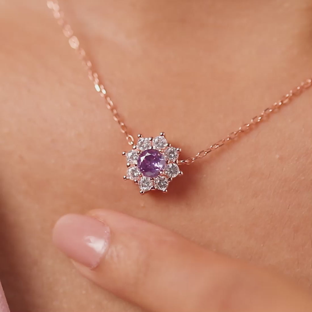 Crafted in 925 sterling silver with rose-gold plating, the necklace features a floral motif of round cut purple CZ stones on a link chain. Lightweight and adjustable with a lobster clasp, it adds a soft pop of colour and elegance to daily or festive looks.
