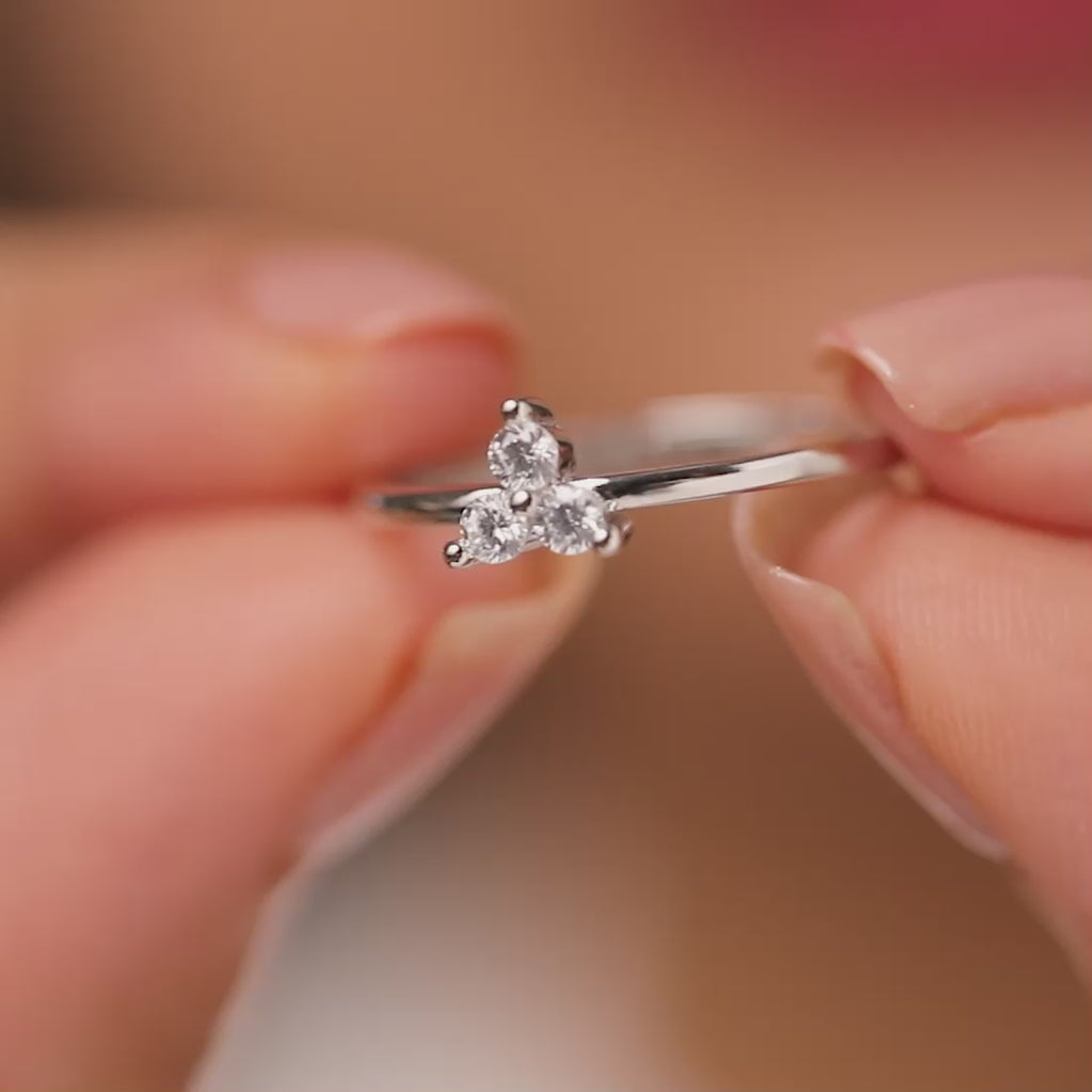Crafted in rhodium-plated 925 sterling silver, the trio of CZ stones is set gracefully on a sleek band, symbolizing love, luck, and light.