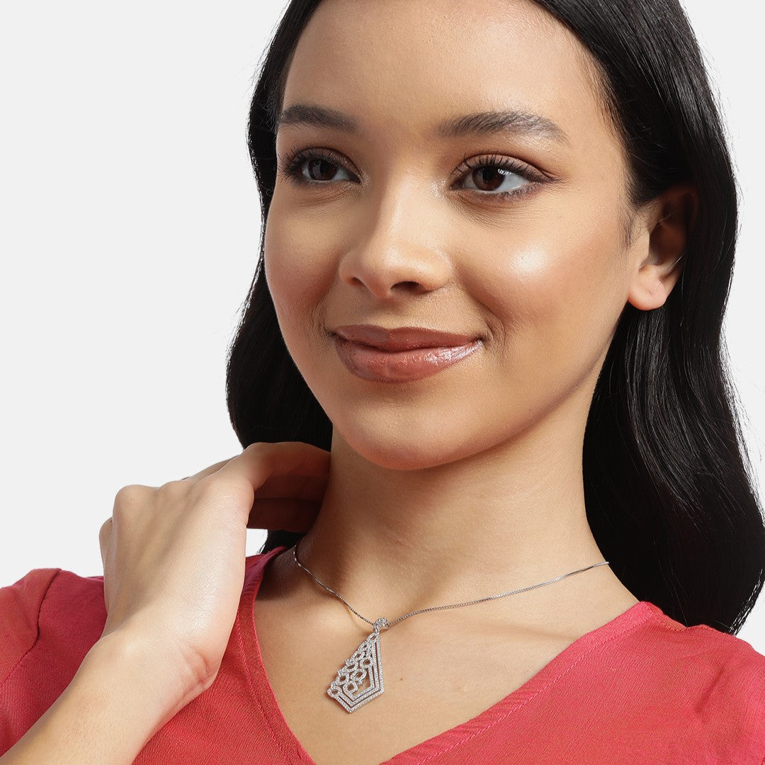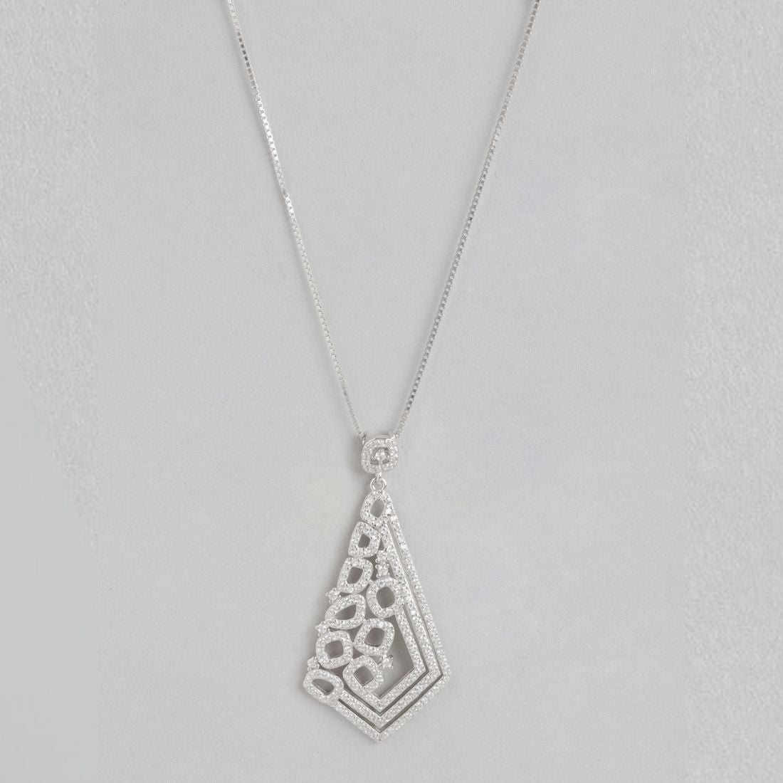 Product Description:- Make a bold statement with our Abstract Brilliance Elegance Pendant. Crafted from high-quality 925 Sterling Silver and plated with enduring rhodium, this pendant features an intriguing abstract pattern adorned with sparkling Cubic Zirconia. The result is a captivating piece that seamlessly blends sophistication with contemporary allure, making it the perfect choice for adding a touch of refined glamour to any neckline.