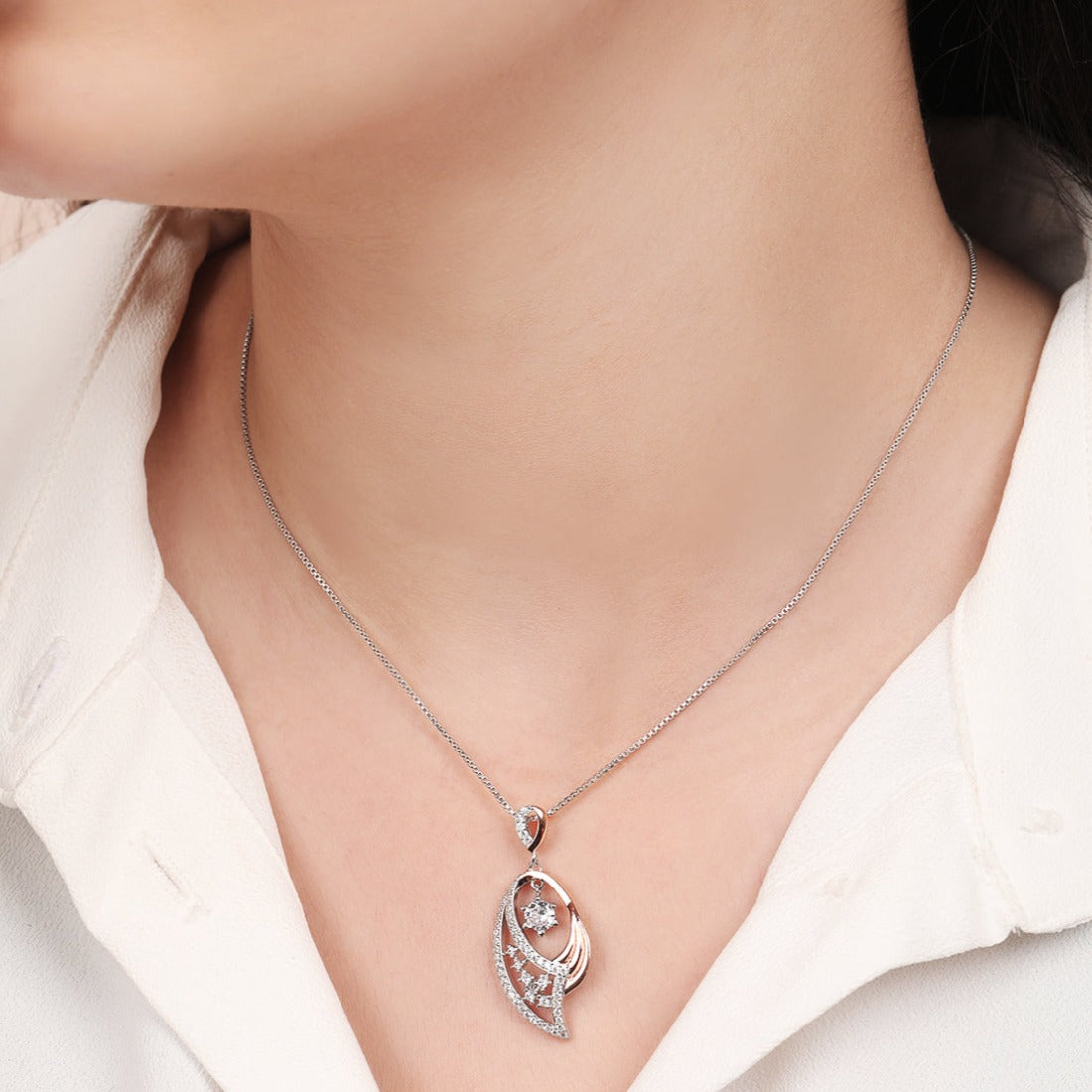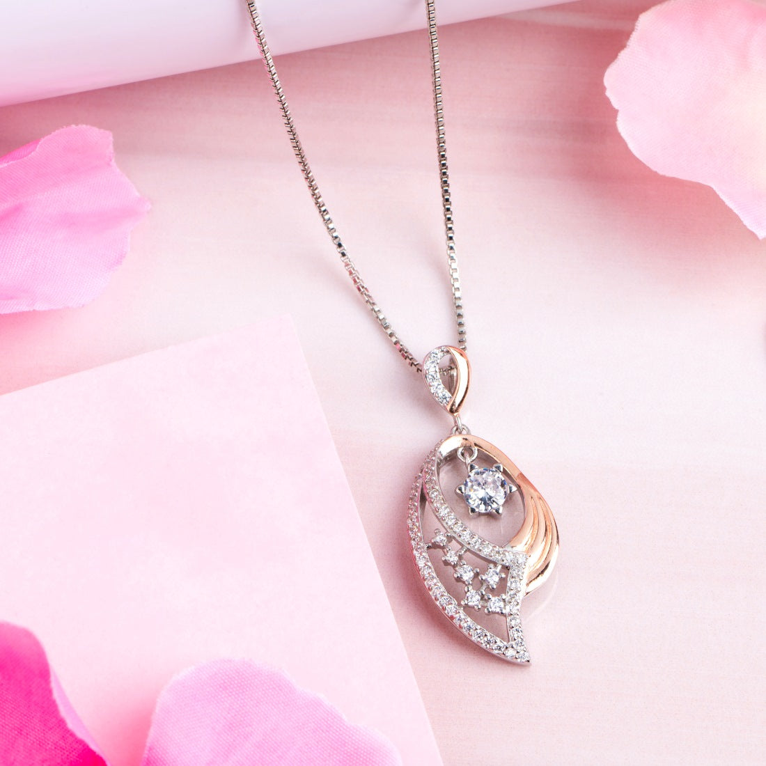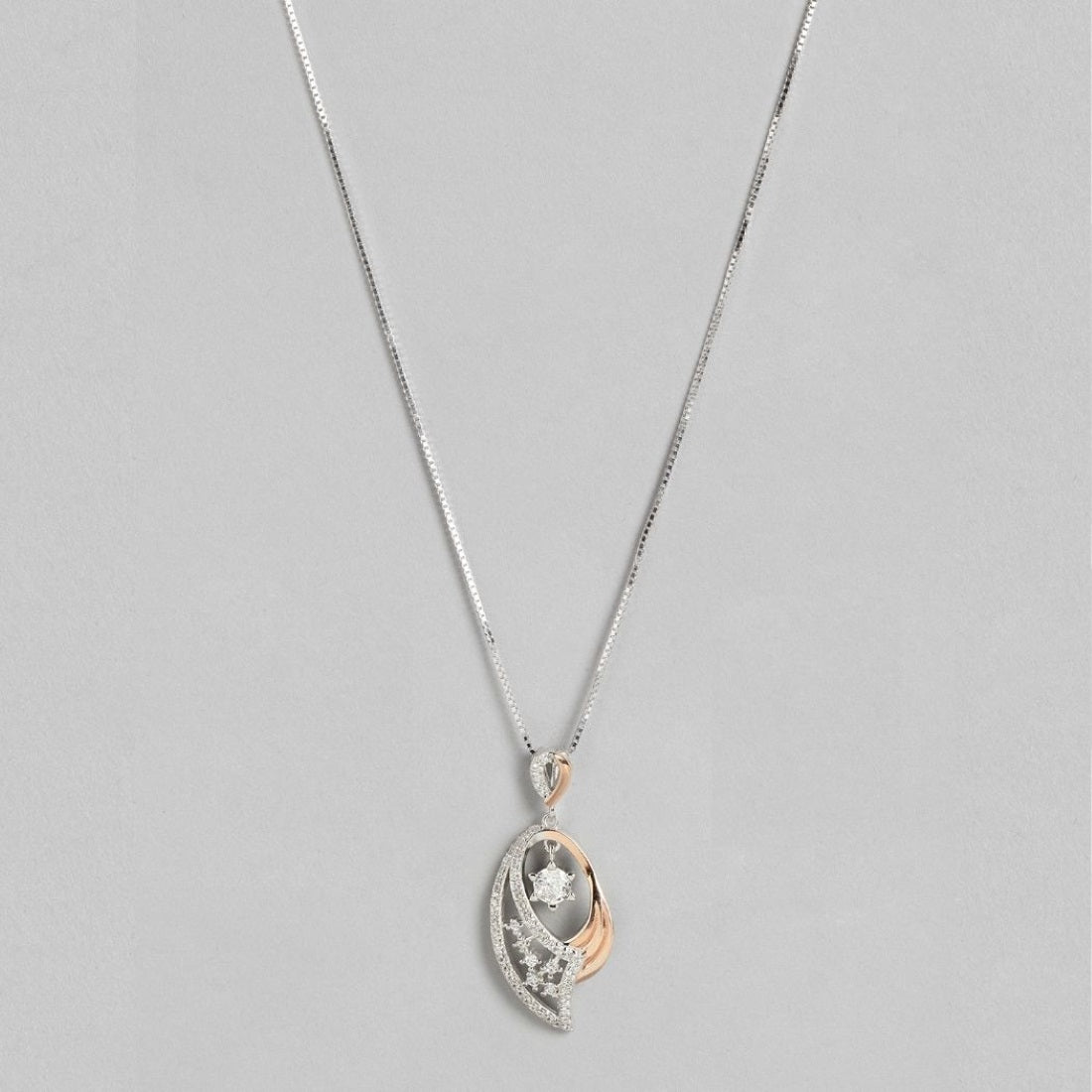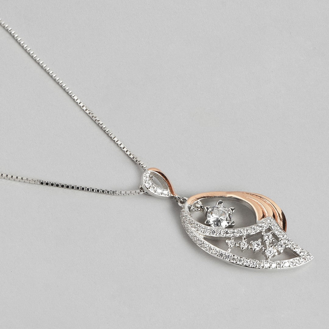 • Product Description:-Dive into the artistry of 'Abstract Radiance Fusion'—a 925 sterling silver necklace featuring an abstract pattern and a fusion of rhodium and rose gold plating. The brilliance of cubic zirconia adds a touch of sparkle, creating a piece that embodies modern allure and artistic sophistication.