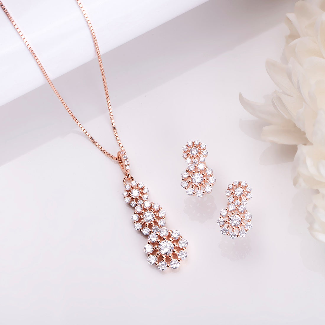 Product Description:- Elevate your style with this luxurious and elegant Blooming Beauty 925 sterling silver rose gold plated jewelry set. The eye-catching gold plating, designer handcrafted details, and high-quality cubic zirconia stones make it perfect for all occasions. Plus, its affordability and compatibility with sensitive skin make it a must-have for any woman. Comes with an authentication certificate for quality assurance.