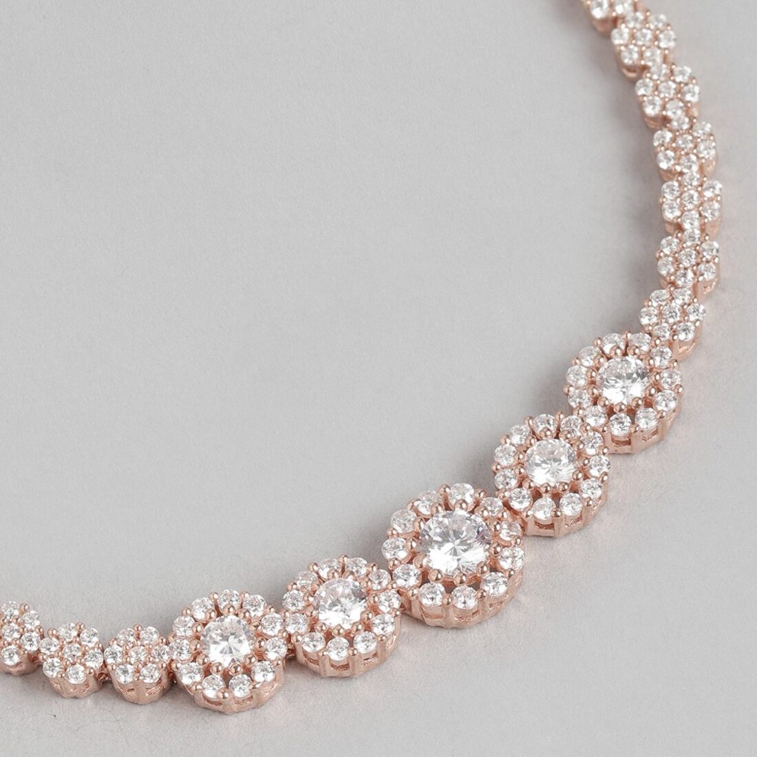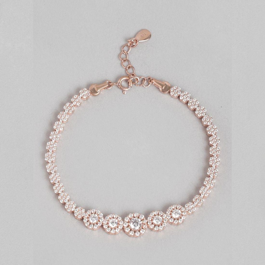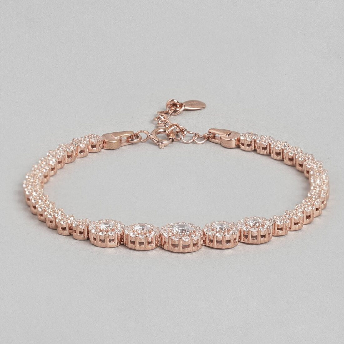 Product Description:- Introducing the Blooming Grace Rose Gold-Plated 925 Sterling Silver Bracelet adorned with sparkling white Cubic Zirconia. This exquisite bracelet combines the timeless beauty of floral design with the elegance of rose gold plating. The delicate petals of the floral pattern are intricately crafted to create a captivating piece of jewelry. The glistening white Cubic Zirconia stones add a touch of brilliance and glamour, enhancing the overall allure of the bracelet. This piece is perfect for those who appreciate the beauty of nature and desire a sophisticated and stylish accessory. Elevate your ensemble and make a statement with the Blooming Grace Rose Gold-Plated Bracelet.