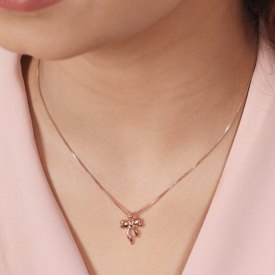 Product Description:- Embrace elegance with our Bow of Elegance rose gold plated 925 sterling silver pendant. This exquisite pendant features a charming bow pattern adorned with sparkling cubic zirconia gemstones, adding a touch of glamour and sophistication to your ensemble. The rose gold plating enhances the beauty of the pendant with a warm and luxurious glow. Make a statement of timeless beauty and feminine charm with this versatile piece that effortlessly complements any outfit.