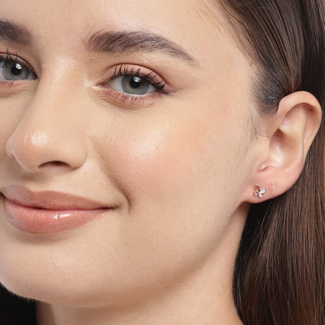 Product Description:- Embrace the delicate beauty of these butterfly-inspired earrings. Crafted with precision from 925 sterling silver and adorned with sparkling cubic zirconia, these enchanting pieces are plated in elegant rose gold. The intricate butterfly design exudes grace and whimsy. They're a perfect accessory to elevate your style, whether for a casual day out or a special evening event. Let these earrings take you on a journey of elegance, symbolizing freedom and transformation, just like a butterfly's delicate flight.