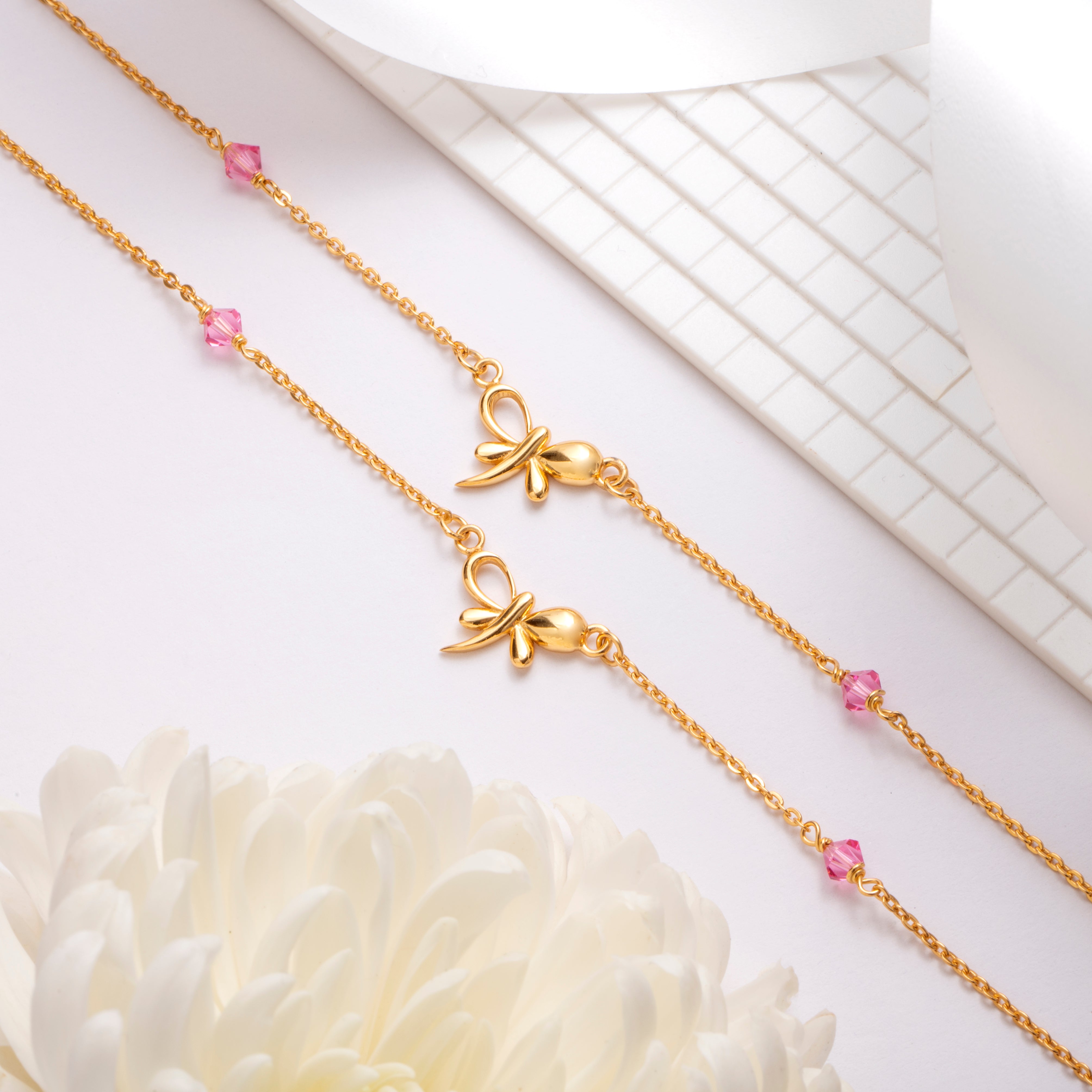 Product Description:- Embrace your inner free spirit with our Butterfly Wings Adjustable Anklet. Crafted with precision from high-quality 925 sterling silver and finished with a lustrous gold plating, this anklet showcases a delicate butterfly wing pattern that exudes grace and charm. The vibrant red cubic zirconia stones add a touch of vibrancy and allure to the design. The adjustable feature ensures a comfortable fit for all. Whether worn with casual or dressy outfits, our Butterfly Wings Anklet is a symbol of freedom, beauty, and self-expression. Let your style take flight with this stunning piece of jewelry.