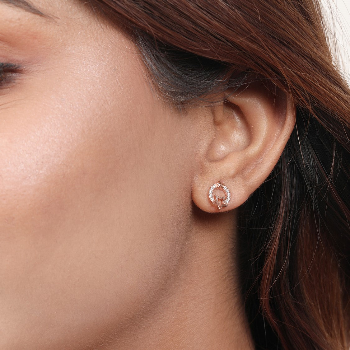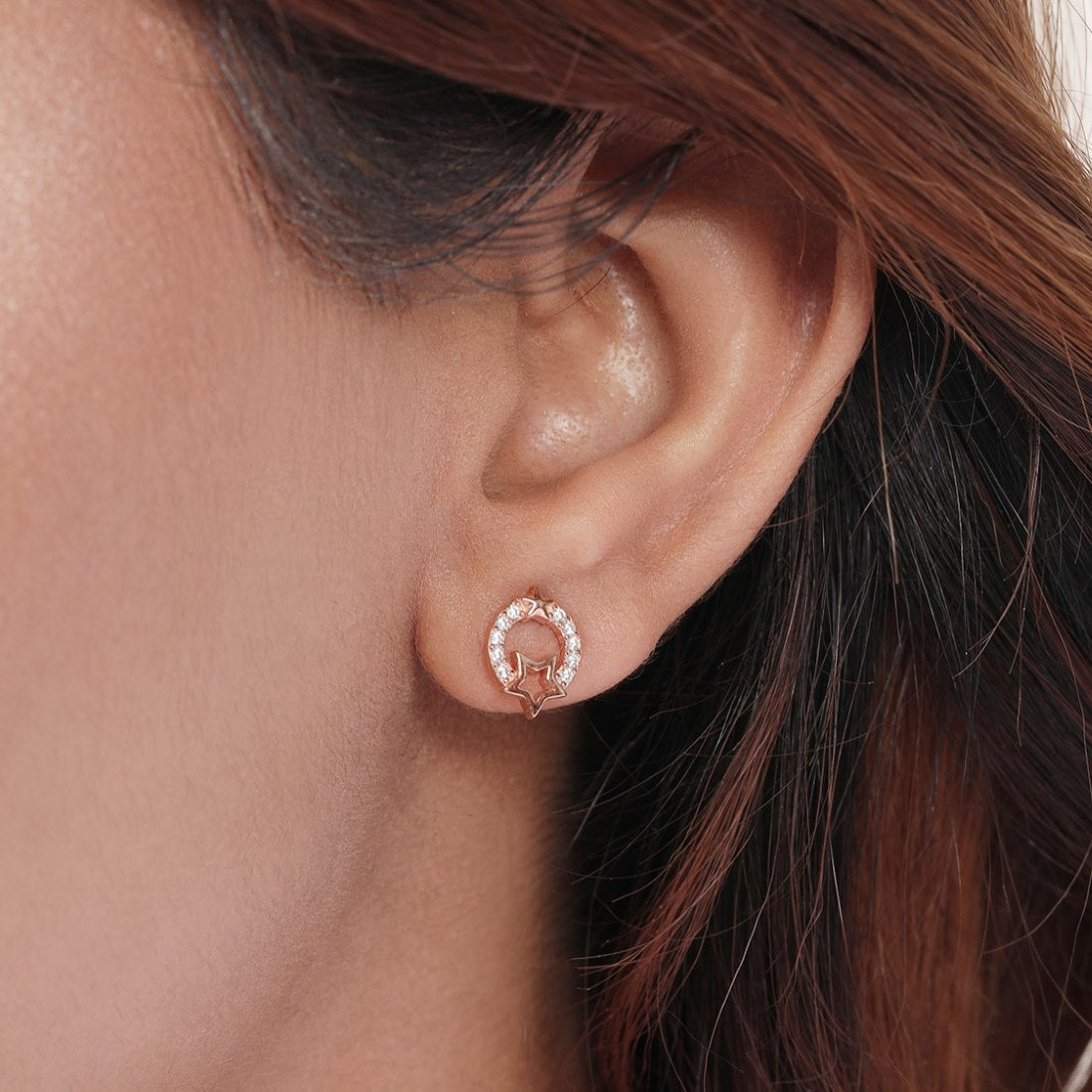 Product Description:- Adorn your ears with the magic of the cosmos. Our 925 sterling silver earrings feature a captivating blend of stars and circles, bathed in the warmth of rose gold plating. Each element is embellished with sparkling cubic zirconia, creating earrings that harmonize celestial charm with modern elegance.