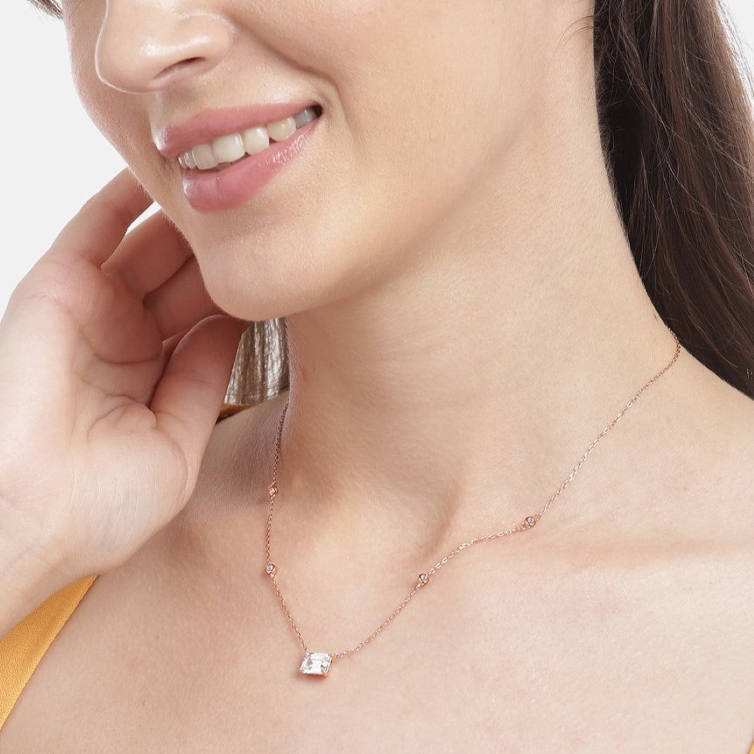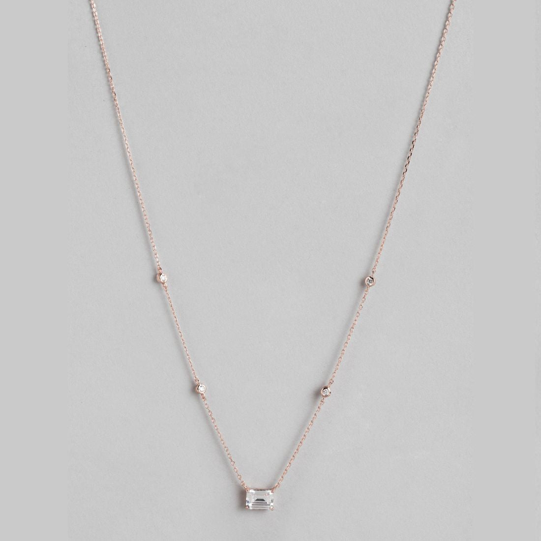 Product Description:- Elevate your elegance with our 'Cherished Luster' necklace. Crafted from 925 sterling silver and adorned with a captivating rose gold finish, this piece exudes timeless charm. The necklace is adorned with brilliant cubic zirconia gems, which glisten like stars in the night sky. 'Cherished Luster' represents the perfect blend of sophistication and sparkle, making it an ideal choice for any occasion. This necklace is a symbol of enduring beauty, perfect for those who appreciate both classic style and contemporary allure.
