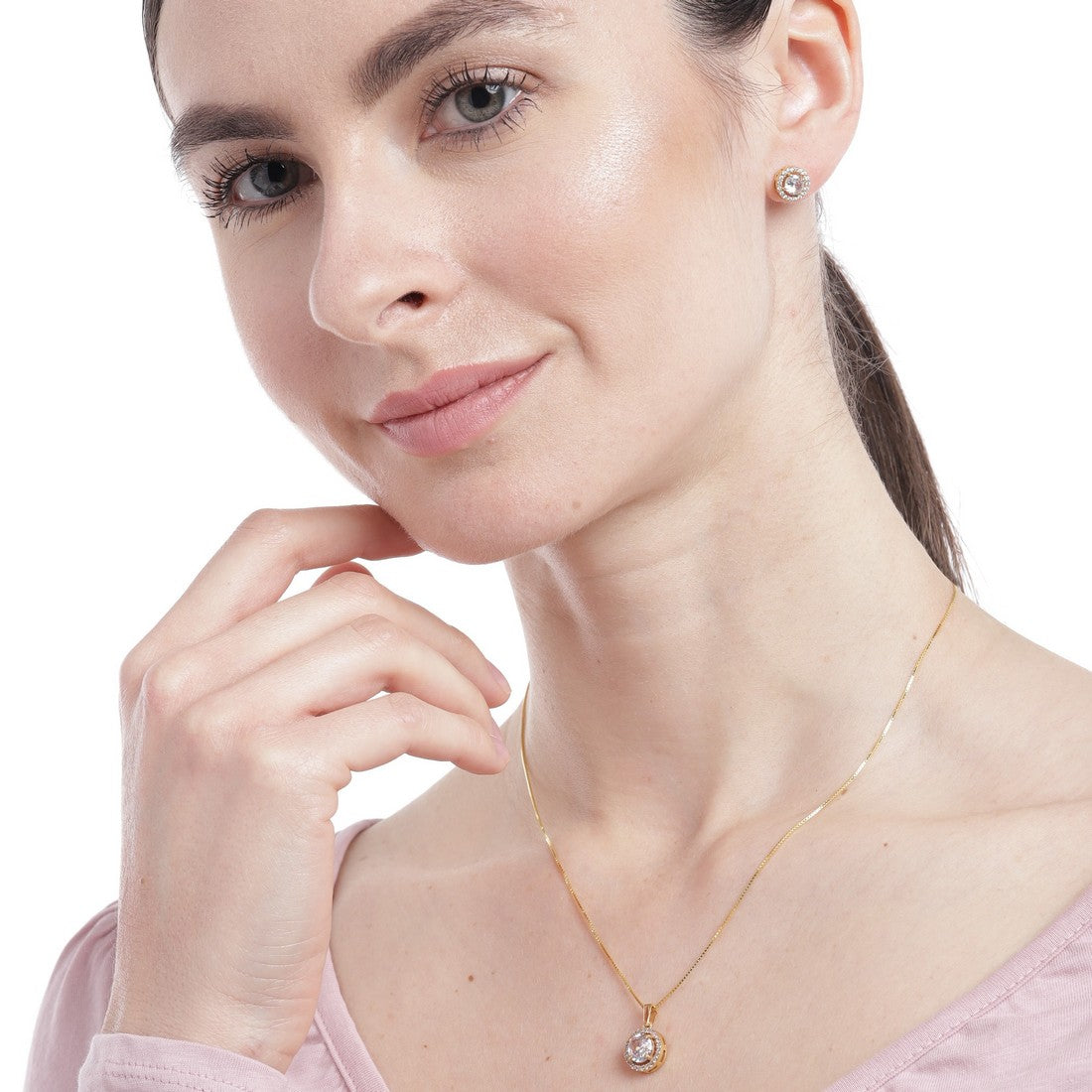 Product Description:- Crafted in 925 sterling silver and finished with a rich golden plating, this set features a dazzling solitaire design that never goes out of style. Perfect for both everyday sophistication and evening glamour, it’s a must-have in every modern jewelry collection.