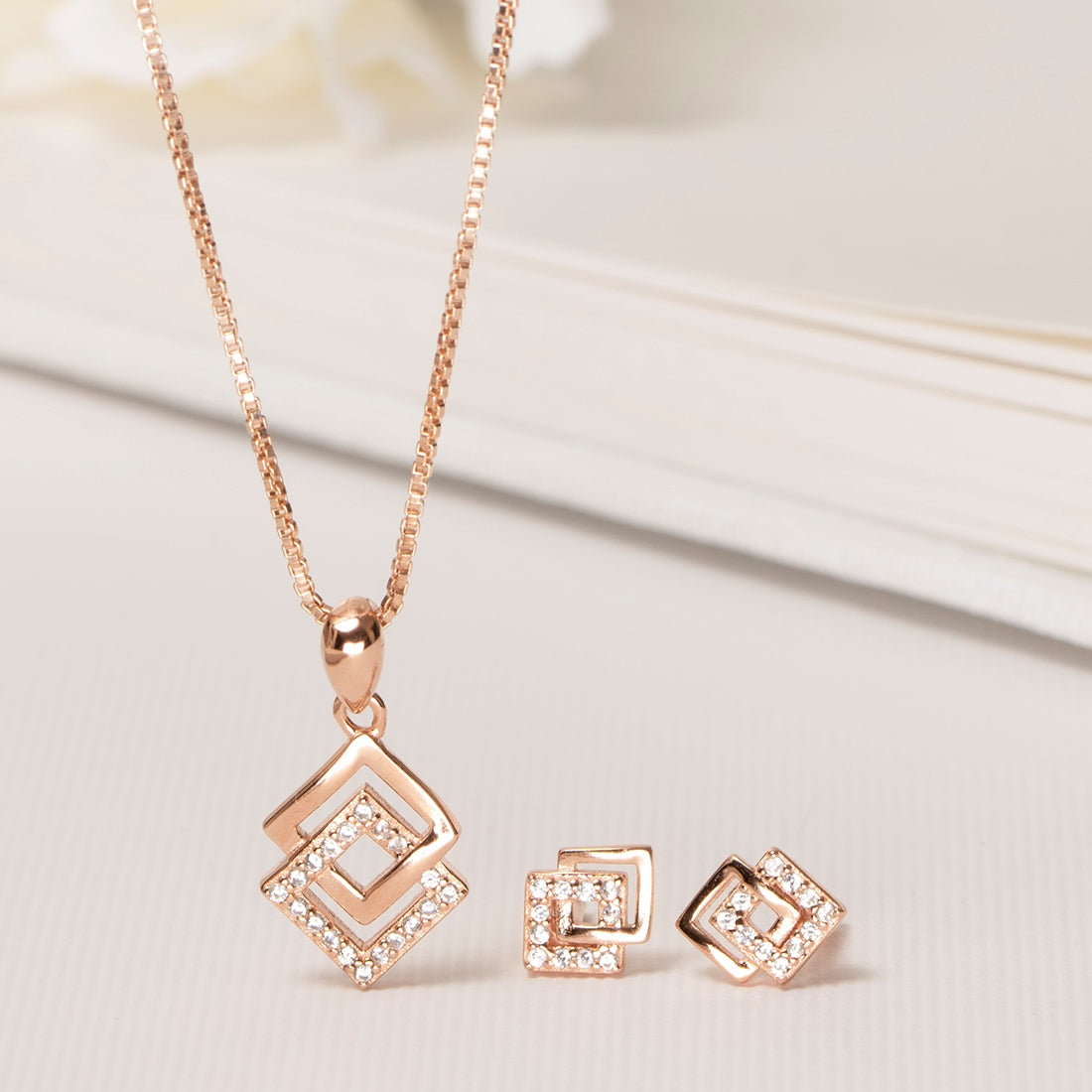 Product Description:- Indulge in the allure of this enchanting jewelry set. Each piece is masterfully crafted, featuring brilliant cubic zirconia stones set in delicate rose gold plating. The set includes a captivating necklace, matching earrings, and a gracefully designed bracelet. Ideal for both casual and formal occasions, this jewelry set is a radiant addition to your collection. Embrace the exquisite beauty of rose gold and the sparkle of cubic zirconia with this stunning ensemble.