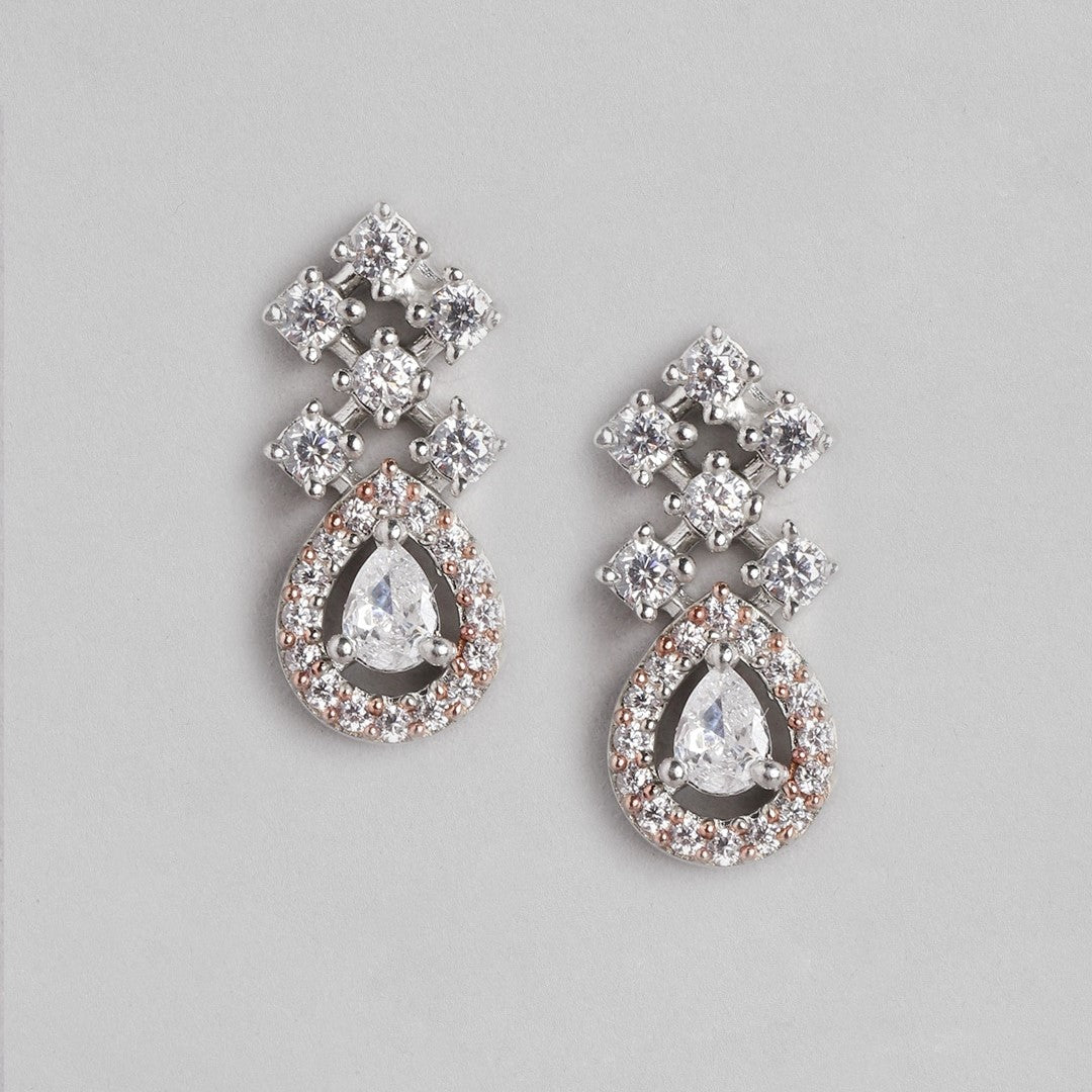 Product Description:- The Dual Radiance Rhodium & Rose Gold-Plated CZ Sterling Silver Stud Earrings exude timeless elegance. Crafted in sterling silver with rhodium and rose gold plating, these earrings feature brilliant-cut cubic zirconia stones for a captivating sparkle. The combination of rhodium and rose gold plating adds a contemporary twist to the classic stud design. Perfect for both everyday wear and special occasions, these earrings are a versatile and stylish addition to any jewelry collection. Purchase yours from ZAVYA for a touch of sophistication.