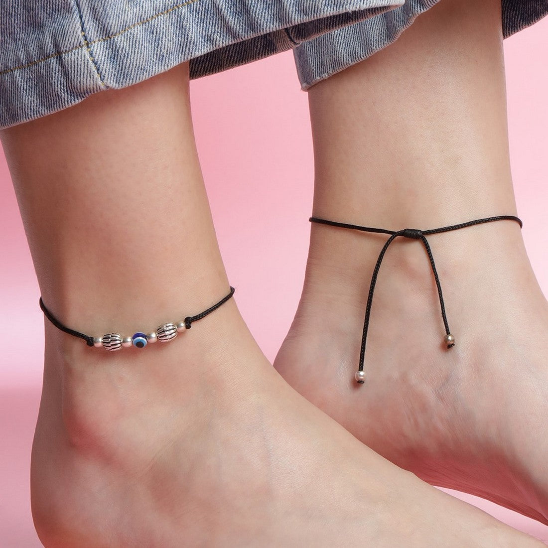 Evil Eyes Rhodium Plated 925 Sterling Silver Thread Anklet