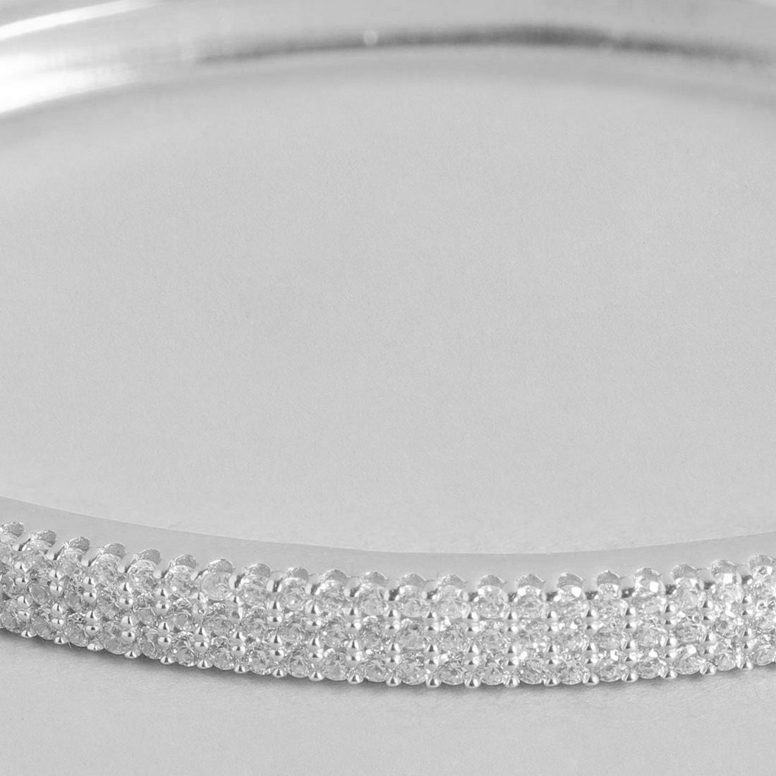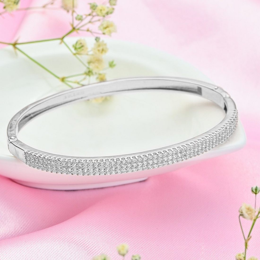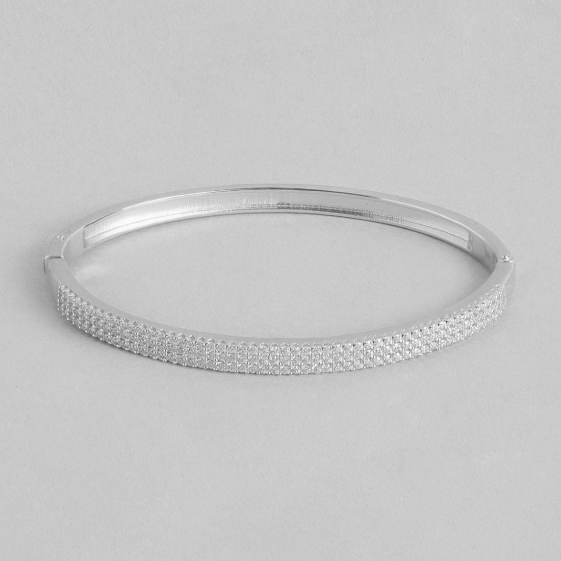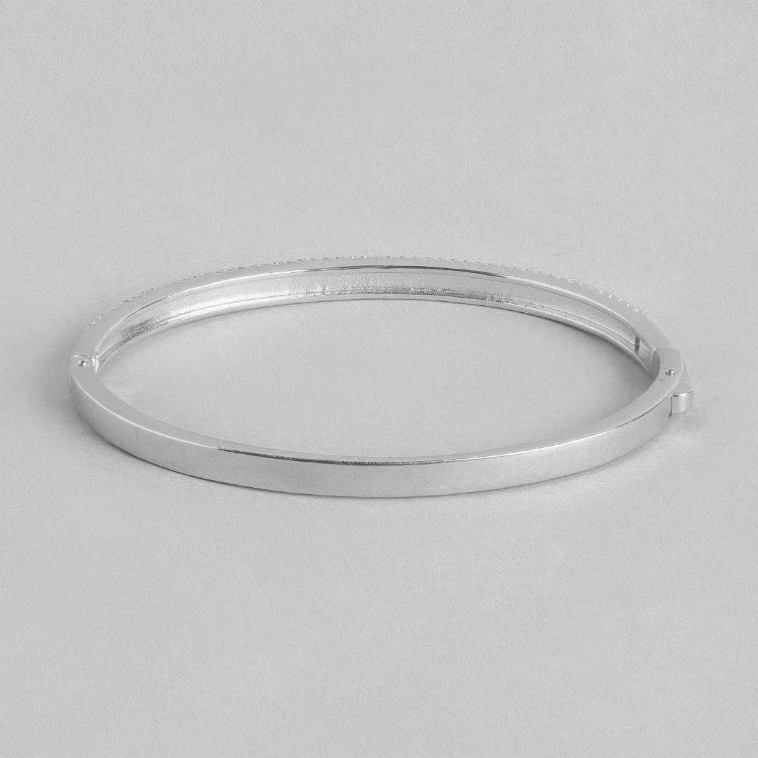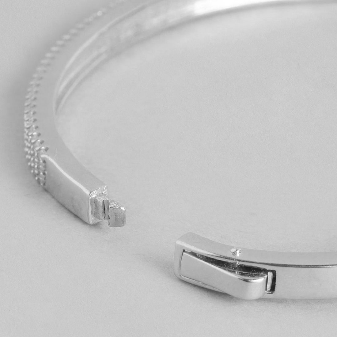 Product Description:- Elevate your style with this exquisite 925 sterling silver kada bracelet featuring a lustrous rhodium plating and a dazzling cubic zirconia gemstone. The combination of high-quality materials and expert craftsmanship results in a sophisticated accessory that adds a touch of glamour to any ensemble. The sleek design and shimmering gemstone make this bracelet perfect for both formal events and everyday wear. Make a statement and enhance your look with this timeless kada bracelet that exudes elegance and luxury.