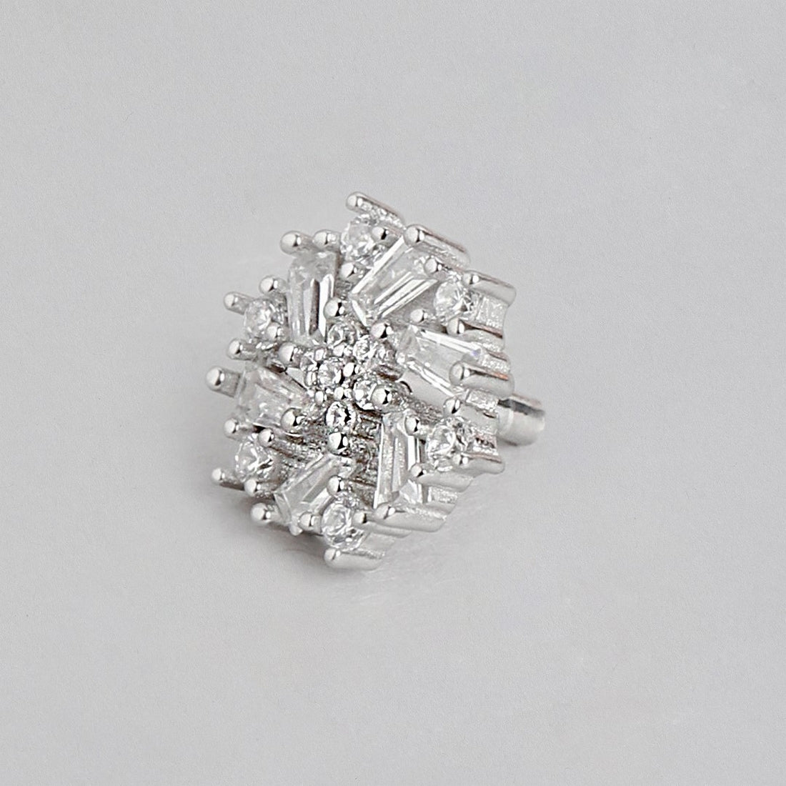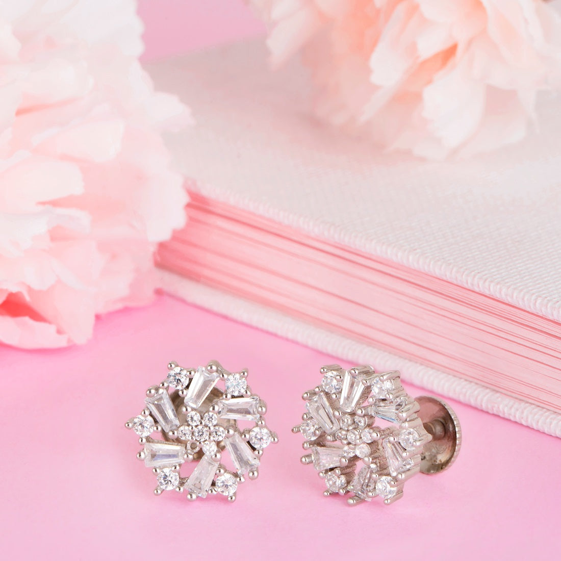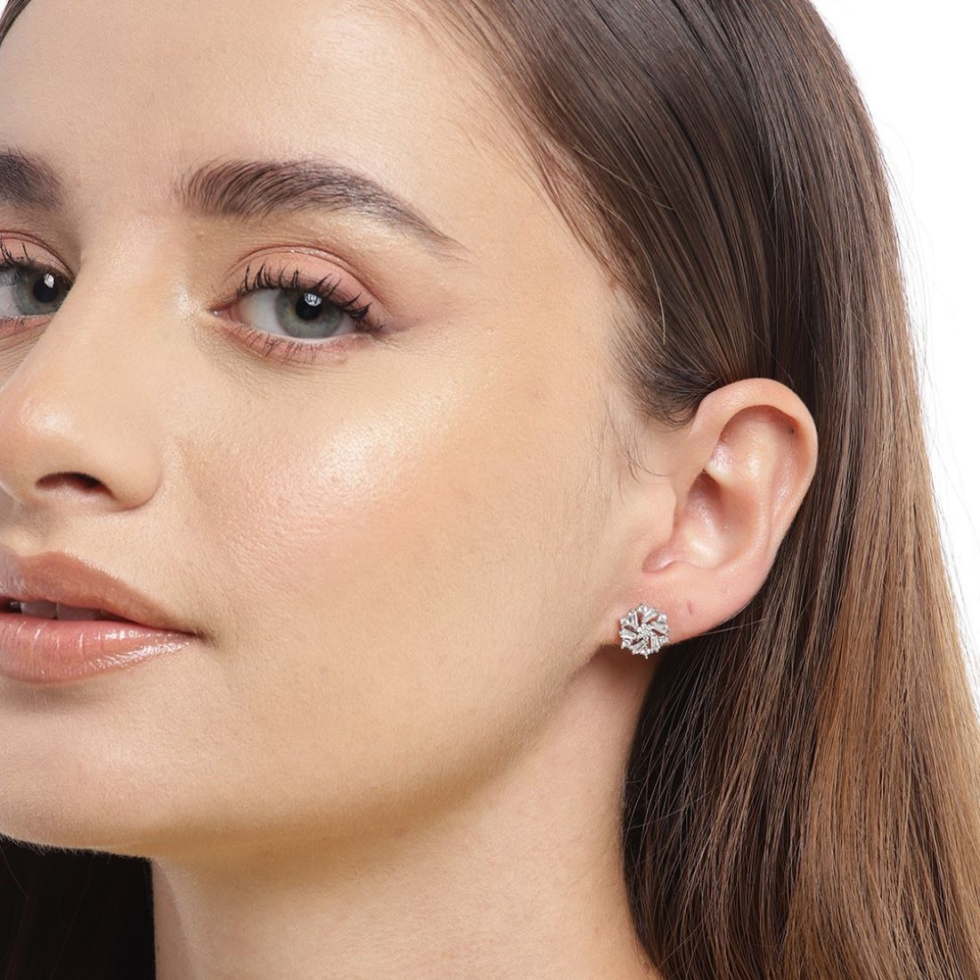 Product Description:- Adorn your ears with the delicate beauty of these rhodium-plated earrings featuring a charming flower design and sparkling cubic zirconia. The intricate details of the petals and the brilliance of the cubic zirconia create an enchanting combination. Perfect for adding a touch of sophistication to your look, these earrings are a versatile accessory that effortlessly transitions from day to night, making them a stylish choice for any occasion.