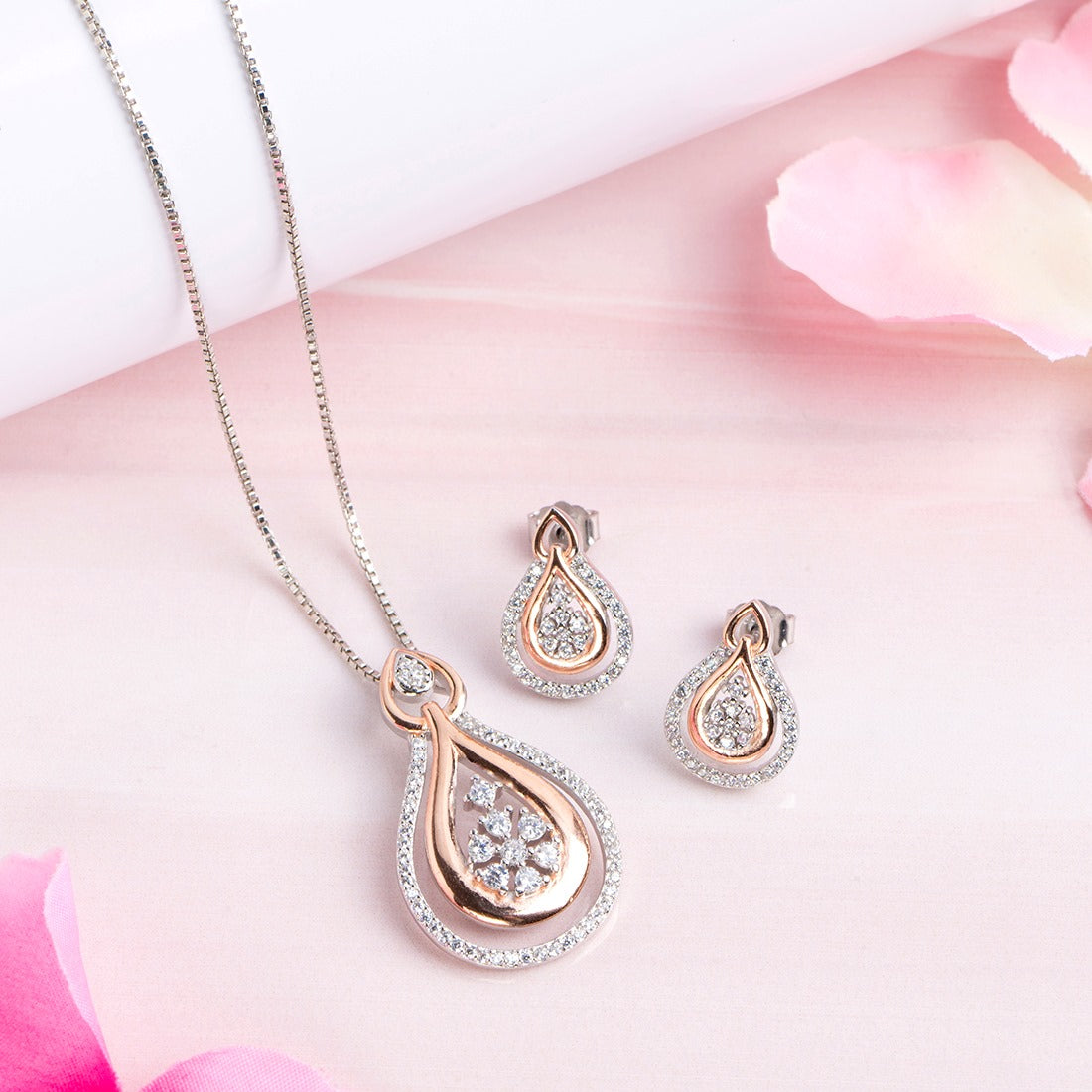 Product Description:- Blossom with elegance wearing our Floral Radiance Harmony Jewelry Set. Crafted from high-quality 925 Sterling Silver and plated with the dual tones of rose gold and enduring rhodium, this set features a charming flower pattern adorned with sparkling Cubic Zirconia. The result is a captivating ensemble that seamlessly blends sophistication with natural allure, making it the perfect choice for adding a touch of refined glamour to any occasion.