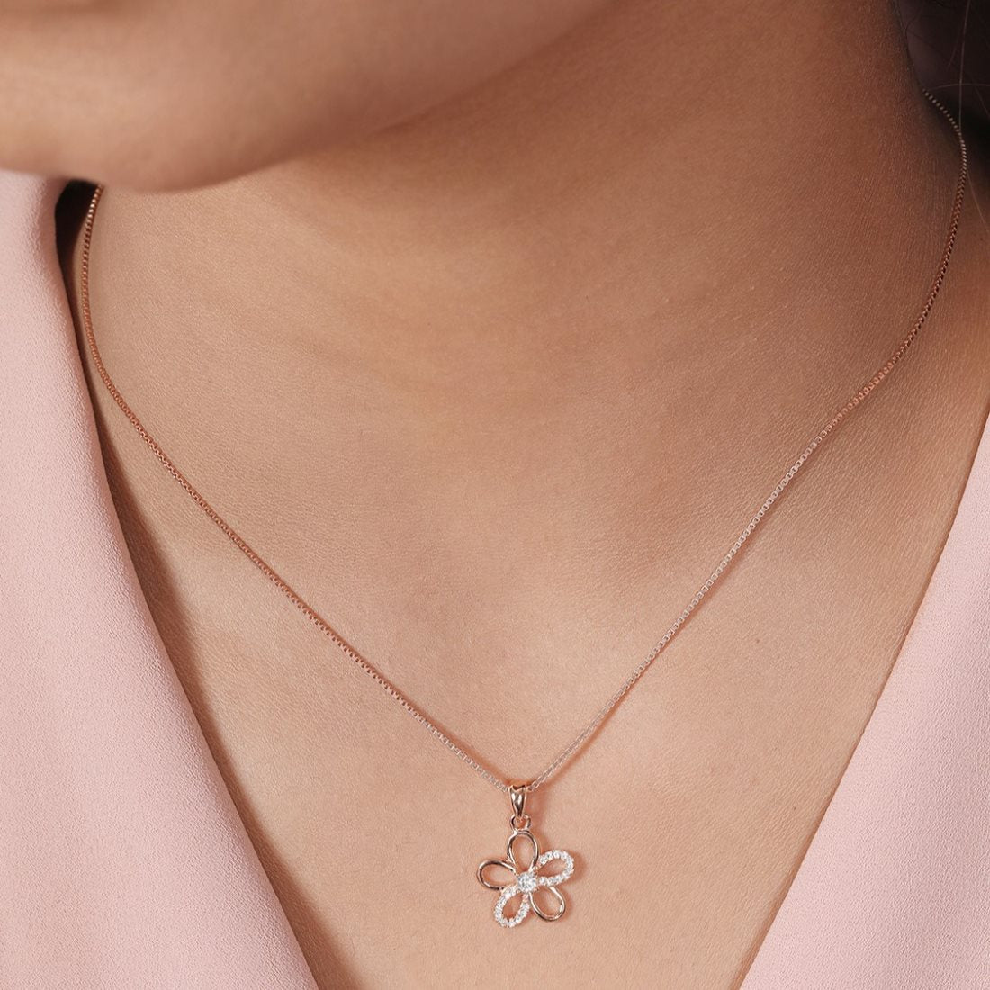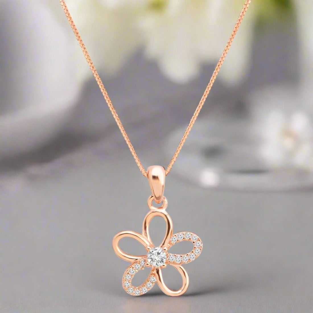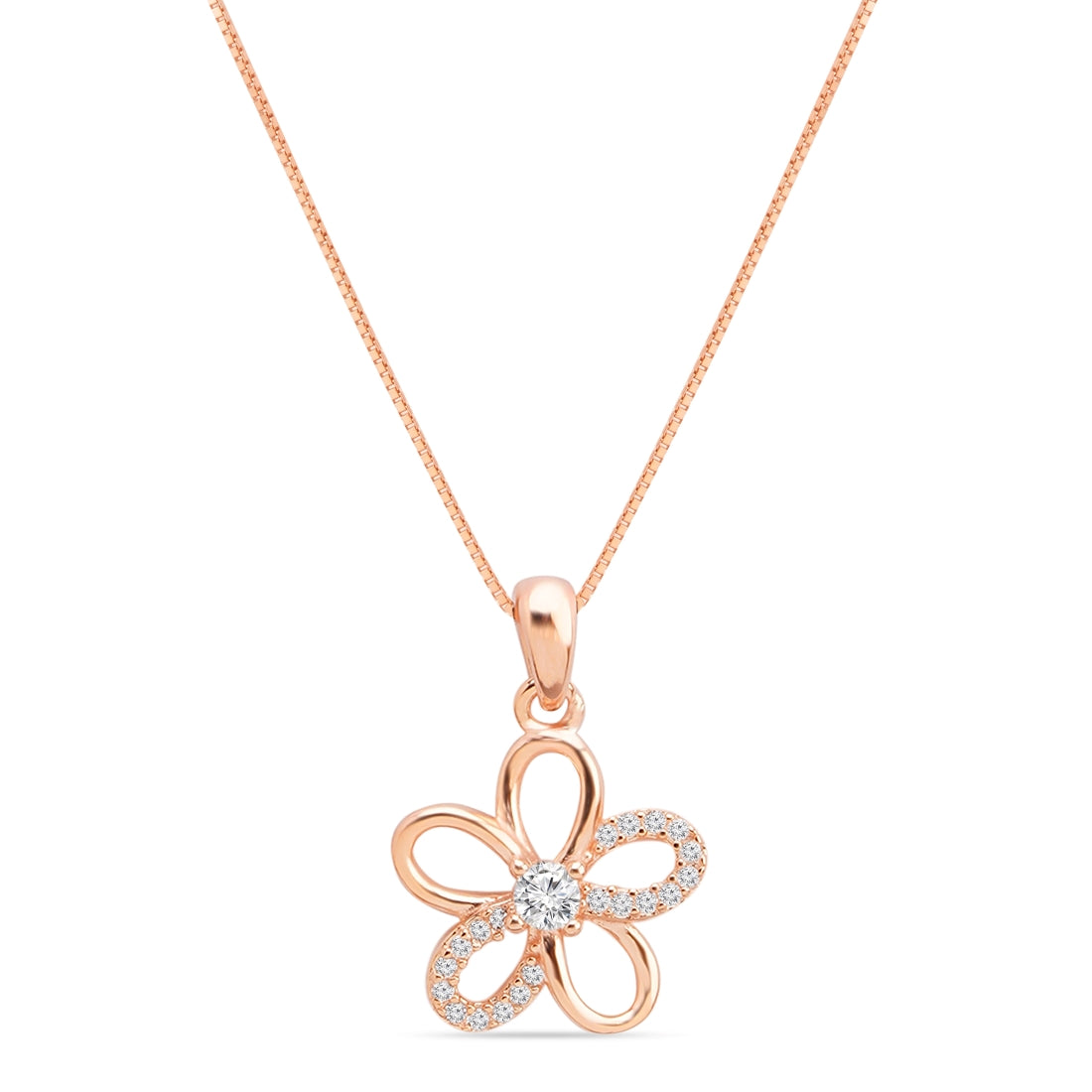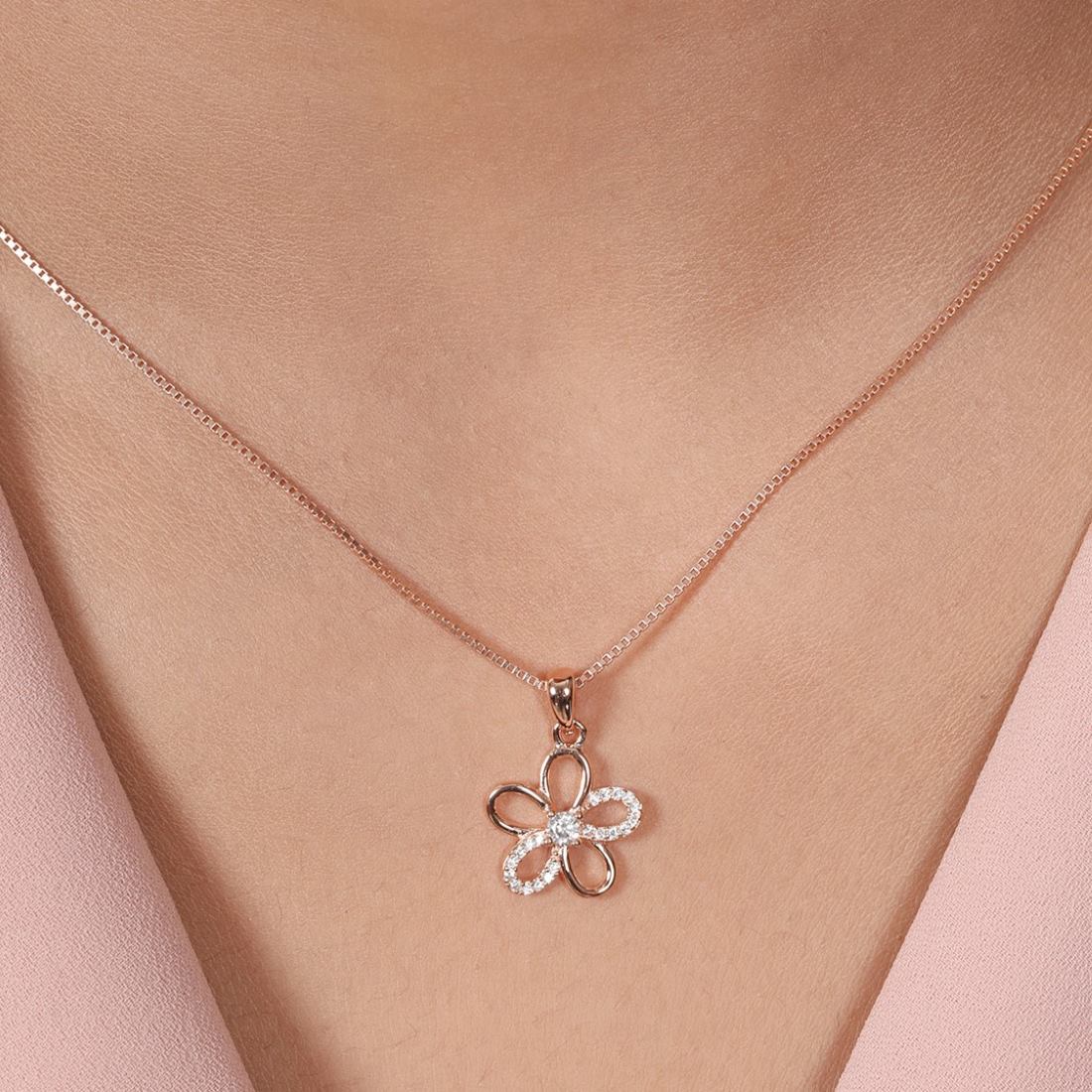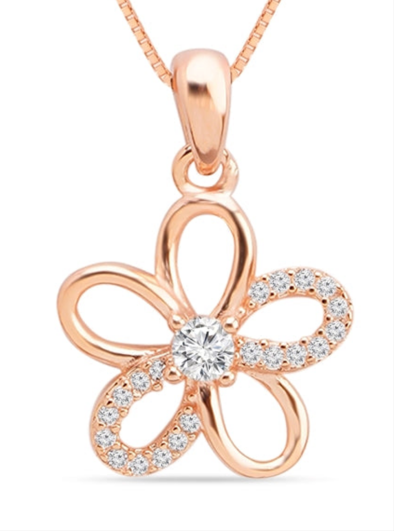 Product Description:- Embrace the beauty of nature with our Floral Radiance rose gold plated 925 sterling silver pendant. This exquisite pendant features a stunning flower pattern adorned with sparkling cubic zirconia gemstones, adding a touch of glamour and sophistication to your ensemble. The rose gold plating enhances the beauty of the pendant with a warm and luxurious glow. Make a statement of timeless beauty and feminine charm with this versatile piece that effortlessly complements any outfit.