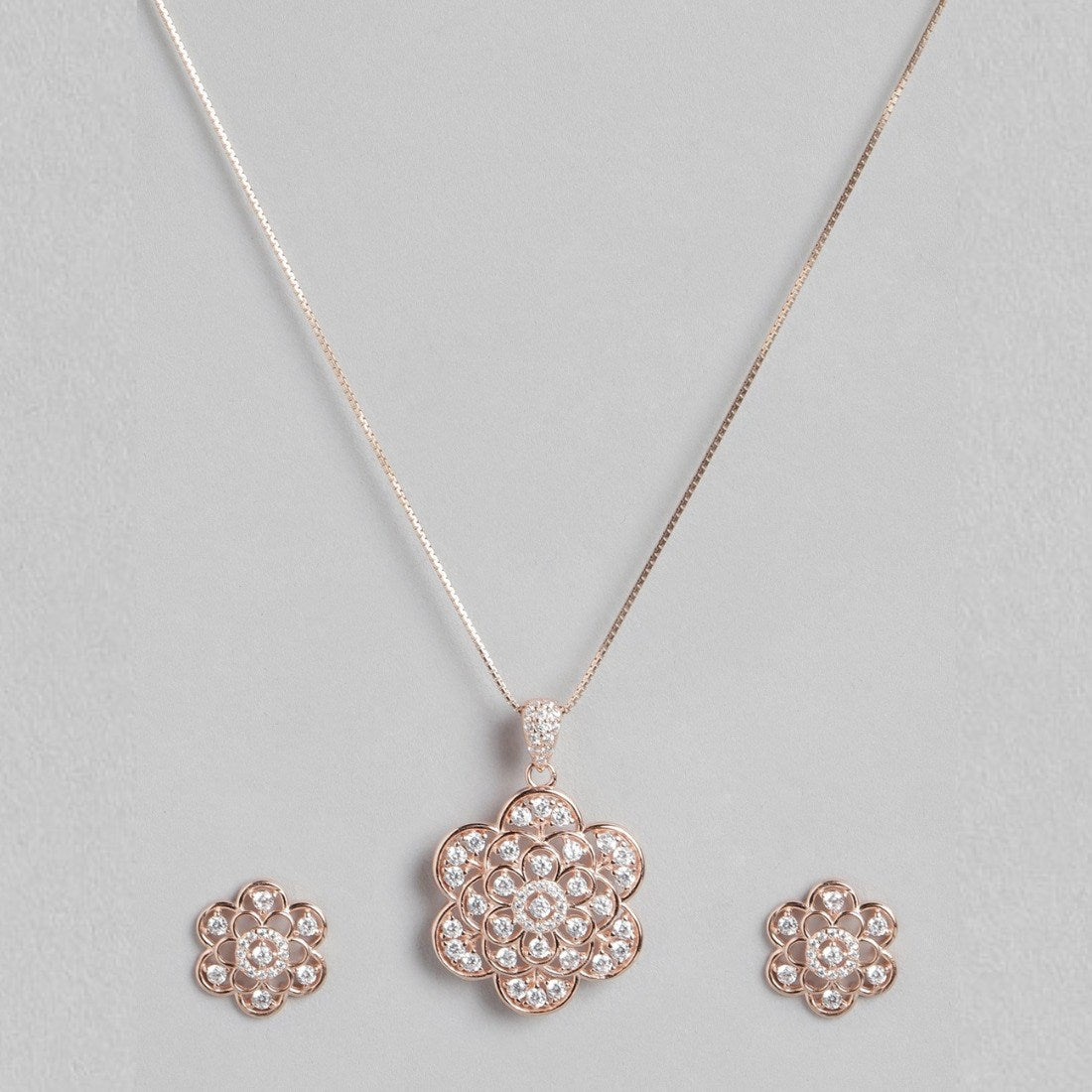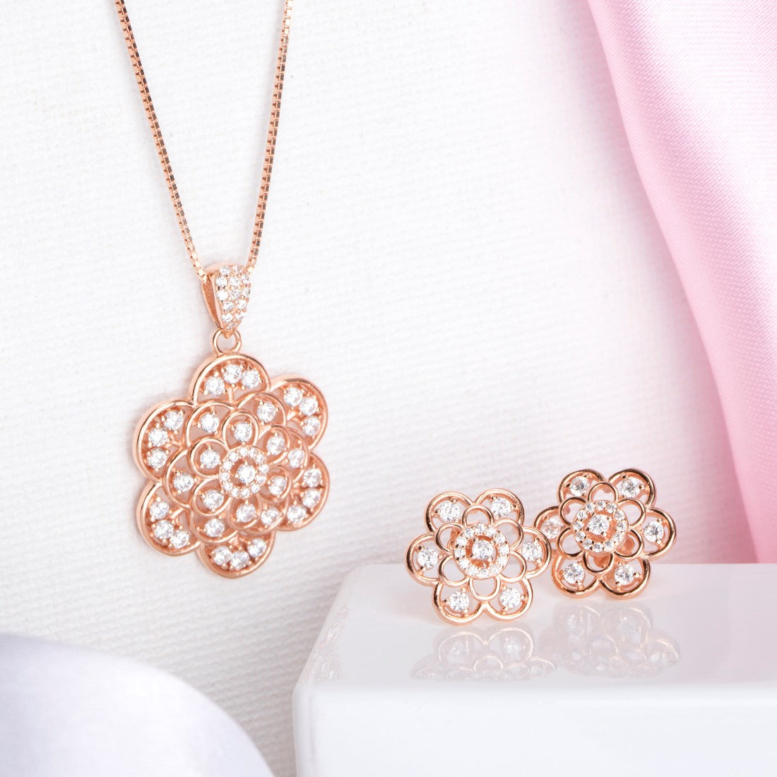 Product Description:- Adorn yourself with the enchanting beauty of our Floral Radiance jewelry set. This stunning ensemble, featuring a delicate flower pattern crafted from 925 sterling silver and plated in radiant rose gold, is accentuated by shimmering cubic zirconia gemstones. Each piece in this set, from the necklace to the earrings, exudes a timeless elegance reminiscent of a blooming garden. Embrace the allure of nature's bounty with Floral Radiance and let your inner beauty flourish like a resplendent flower in full bloom.