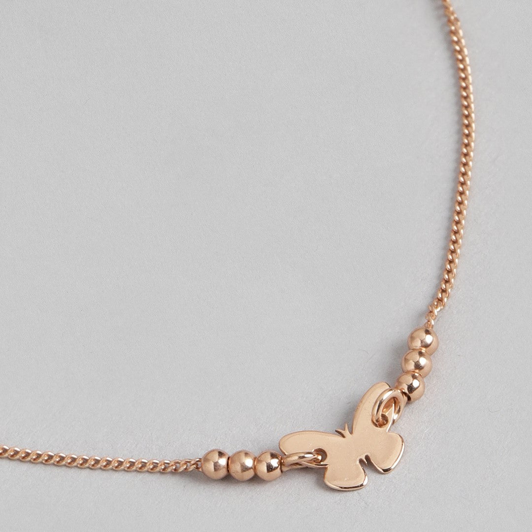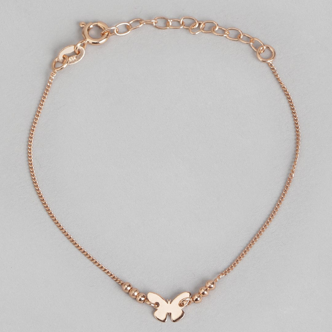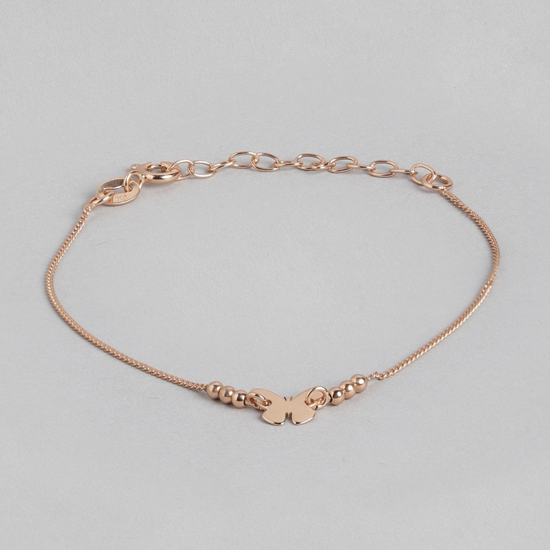 Product Description:- Elevate your style with the delicate charm of our 'Fluttering Elegance' Rose Gold-Plated 925 Sterling Silver Bracelet. Meticulously crafted, this bracelet features a graceful butterfly charm suspended from a radiant rose gold-plated chain. The sterling silver base ensures lasting brilliance and strength. Symbolic of transformation and grace, the butterfly charm adds a touch of whimsy to your ensemble. Whether for everyday wear or special occasions, 'Fluttering Elegance' embodies timeless beauty and elegance, capturing the essence of nature's enchantment in a wearable work of art.