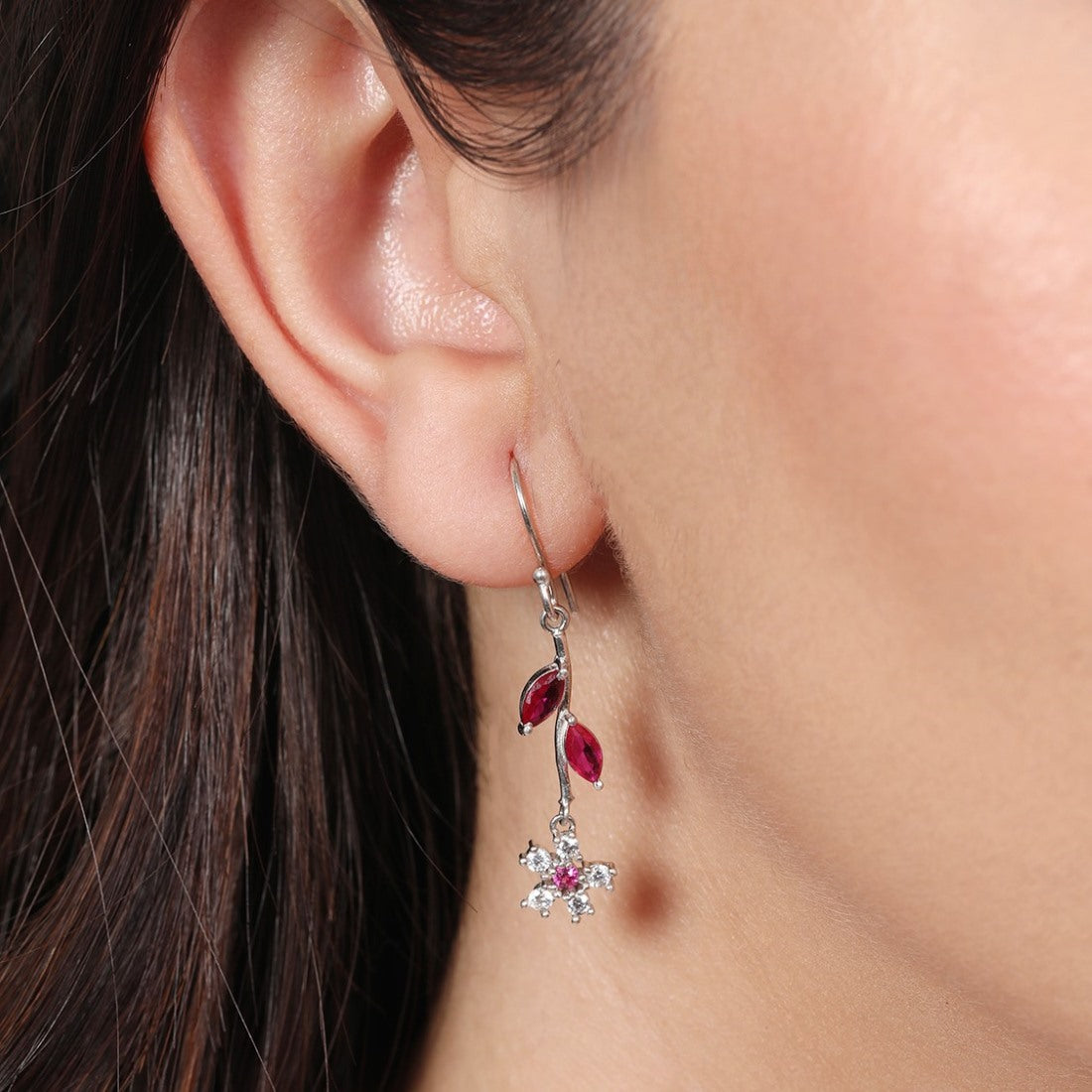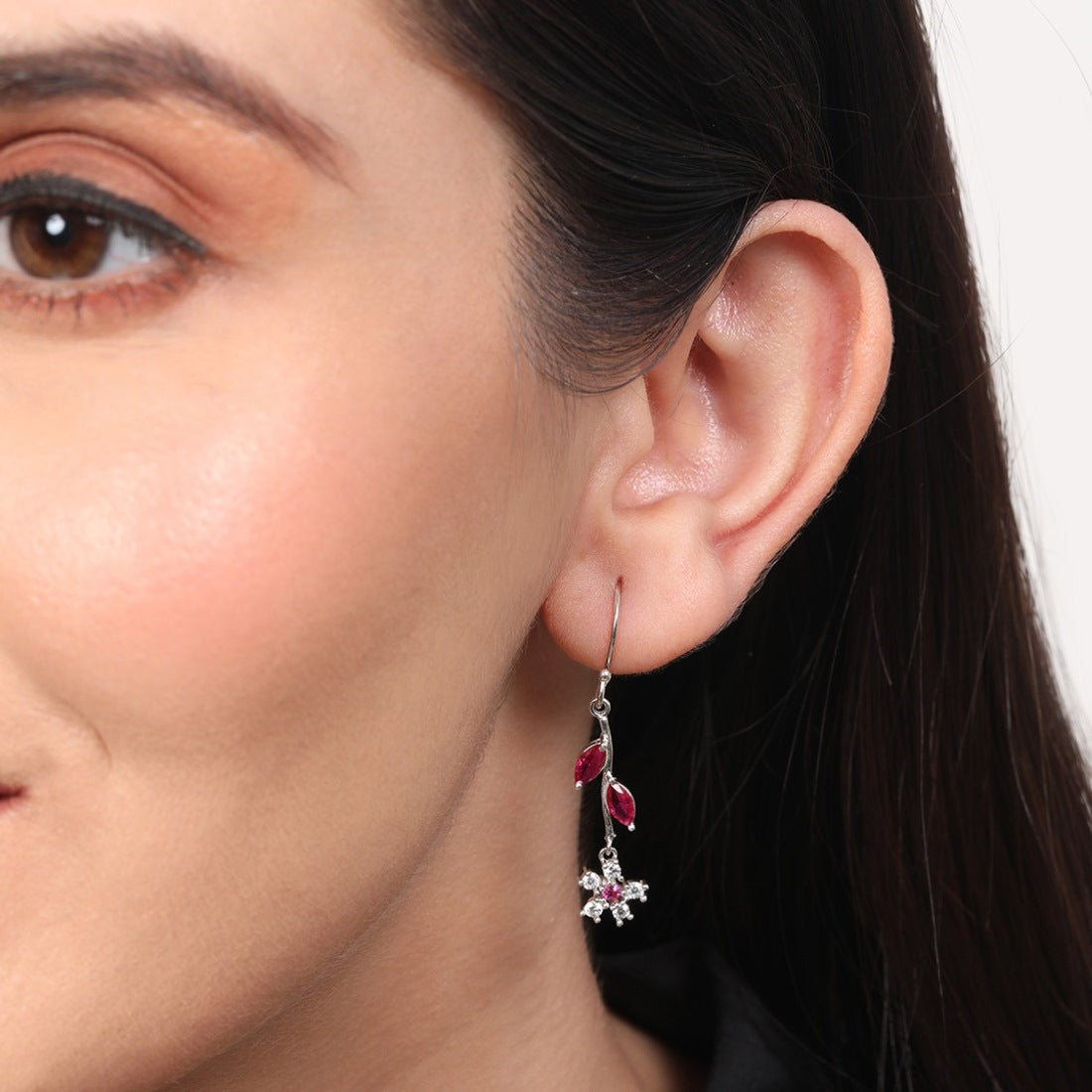 Product Description:- Embrace the beauty of nature with our enchanting 925 sterling silver earrings, meticulously plated in gleaming rhodium. Each earring showcases a delicate floral design adorned with sparkling cubic zirconia gemstones, exuding timeless elegance and feminine charm. The intricate flower pattern adds a touch of sophistication to any ensemble, whether you're dressing up for a special occasion or adding a hint of glamour to your everyday look. Elevate your style with these exquisite earrings and let your inner radiance shine. Perfect for gifting or treating yourself to a touch of luxury, these earrings are sure to become a treasured addition to your jewelry collection.