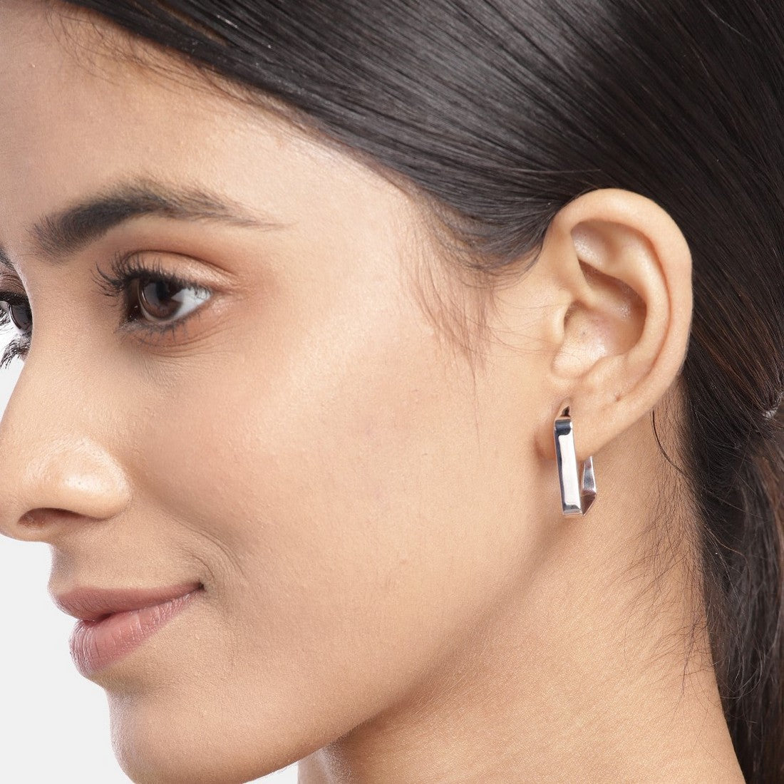 Product Description:- Elevate your style with our 'Geometrical Elegance' rhodium-plated 925 sterling silver hoops. The sleek and modern design blends the timeless allure of silver with a contemporary touch. These hoops radiate sophistication and versatility, making them the perfect accessory for any occasion. With their unique geometry, they add a dash of edgy charm to your look while maintaining an elegant simplicity that transcends trends.