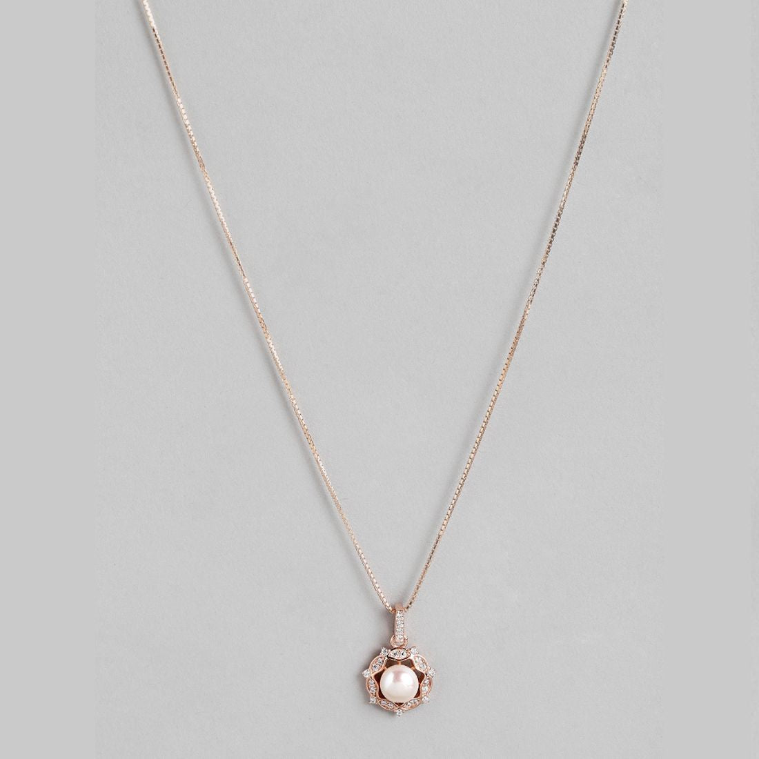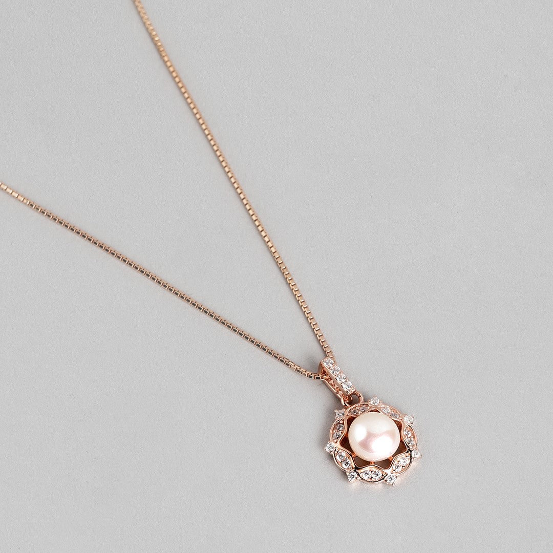 Product Description:- Discover 'Glowing Harmony,' where the radiance of rose gold meets the timeless elegance of pearls and the sparkle of cubic zirconia. This pendant is a harmonious blend of sophistication and allure, expertly crafted from 925 sterling silver. The centerpiece features a lustrous freshwater pearl embraced by a halo of dazzling CZ gems, all set against a rose gold backdrop. It's a symbol of grace and beauty, perfect for making a statement on any occasion. Embrace 'Glowing Harmony' and let your style shine.