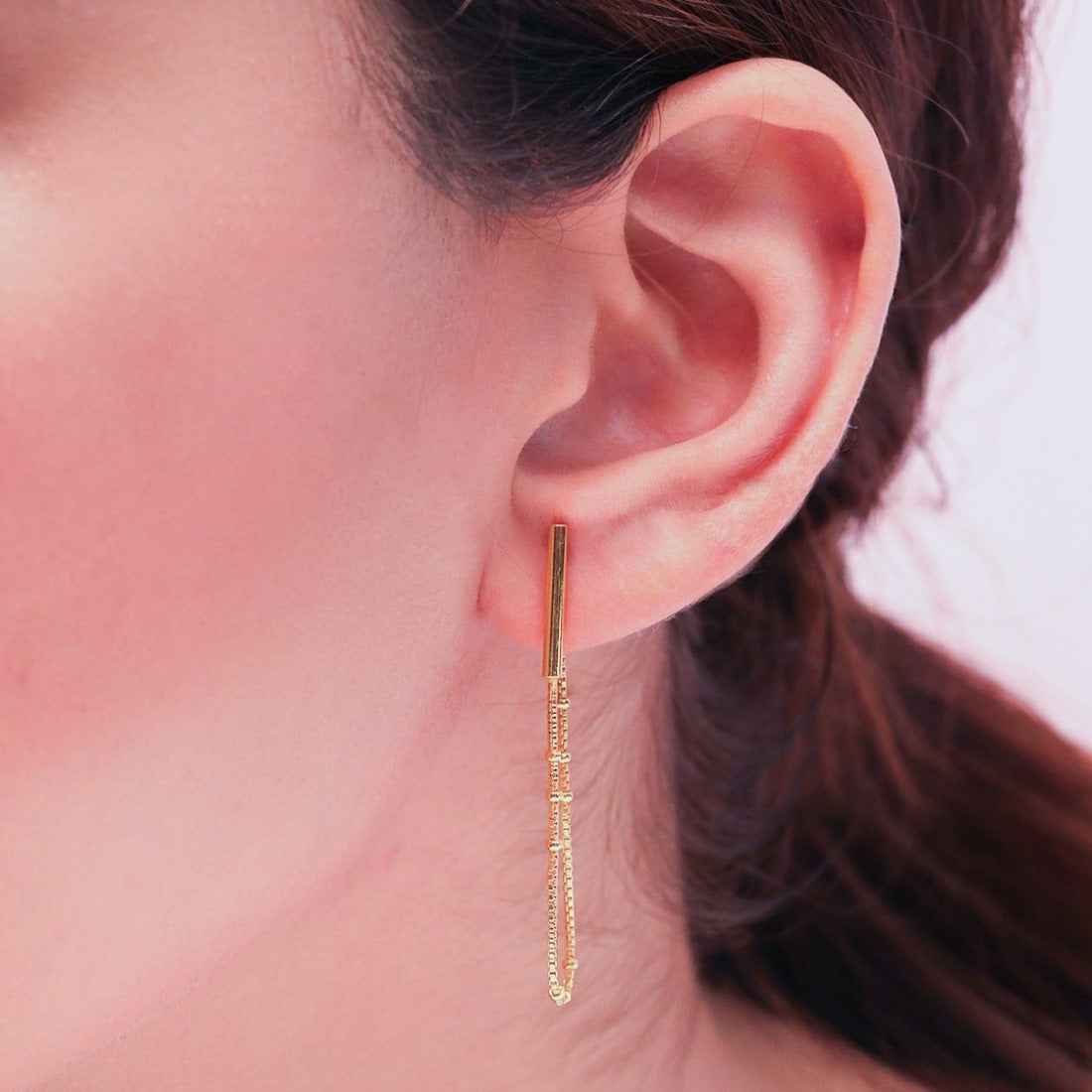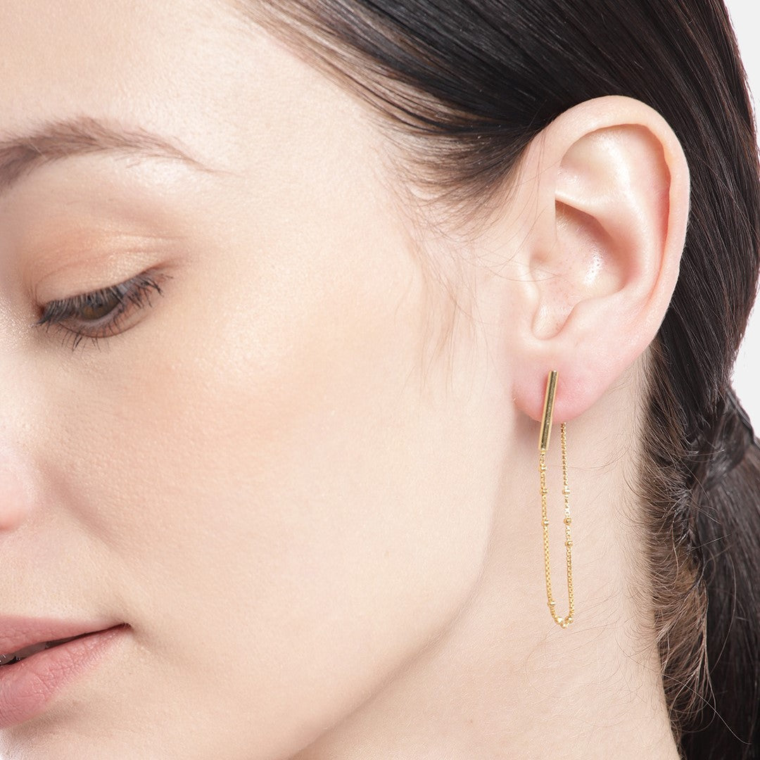 The drop chain pattern adds a unique and fashionable element to these earrings, creating a sense of movement and grace. The delicate chains elegantly dangle from the studs, catching the light and adding a subtle shimmer to your every movement. Whether you're attending a special event or simply want to elevate your everyday style, the Golden Cascade earrings are the perfect choice.