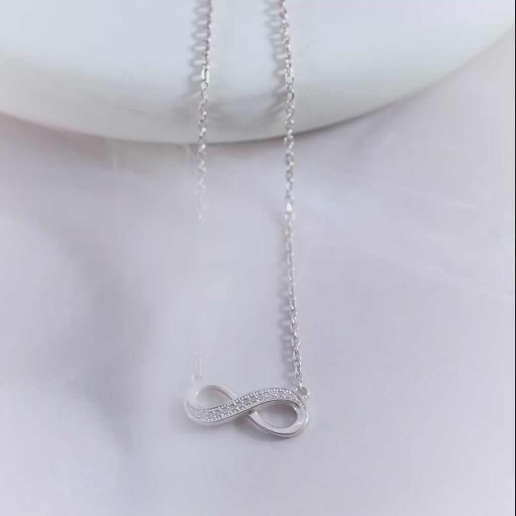 Product Description:- This Infinity Necklace is crafted from 925 sterling silver and finished with a sleek rhodium plating for lasting shine. Featuring a classic infinity symbol, it represents eternal love, strength, and connection. Elegant and versatile, it’s perfect for everyday wear or as a heartfelt gift for someone special.
