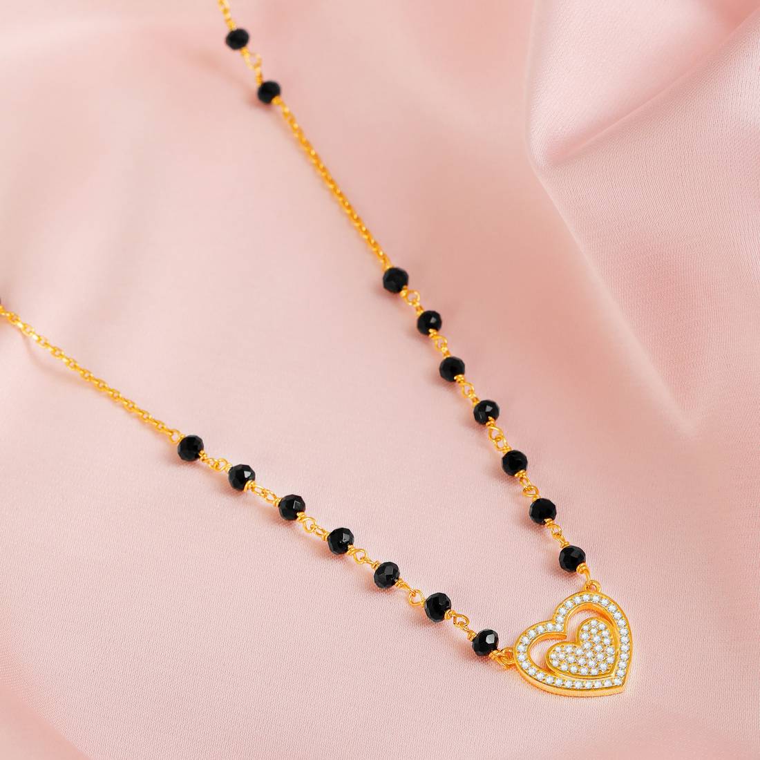 Product Description:- Symbolize everlasting love with our ' 'Heart'  Gold-Plated 925 Sterling Silver Mangalsutra, adorned with a graceful infinity pattern and sparkling cubic zirconia. Meticulously crafted, this mangalsutra radiates warmth and sophistication. The gold plating adds a rosy touch, enhancing the brilliance of the cubic zirconia. Let this piece be a radiant expression of your enduring commitment, capturing attention with its infinite design and shimmering cubic zirconia brilliance—a perfect blend of matrimonial elegance and contemporary allure.