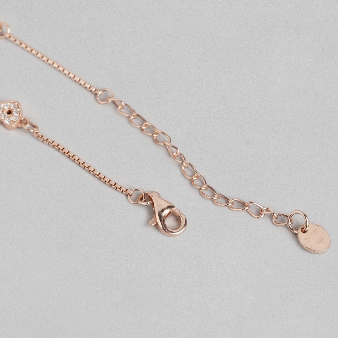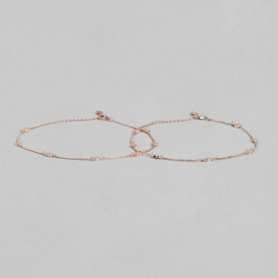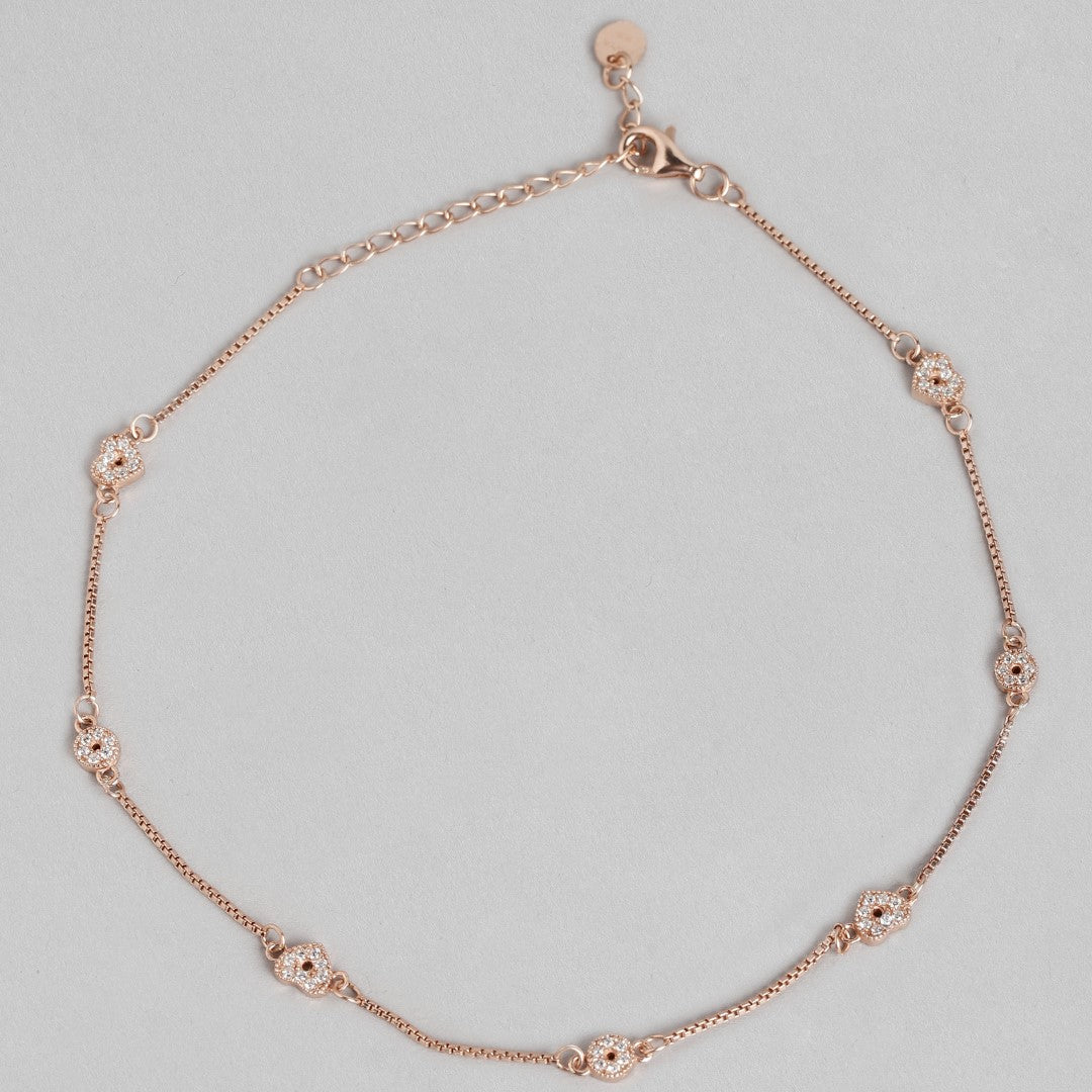 Product Description:- Embrace 'Heartfelt Radiance' with this exquisite rose gold plated anklet. Crafted from 925 sterling silver, it features a charming heart pattern adorned with cubic zirconia stones that glisten with every step. The delicate design radiates love and elegance, making it a perfect accessory for any occasion. Elevate your style and share your radiant affection with this stunning anklet.