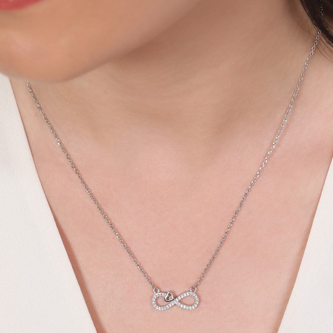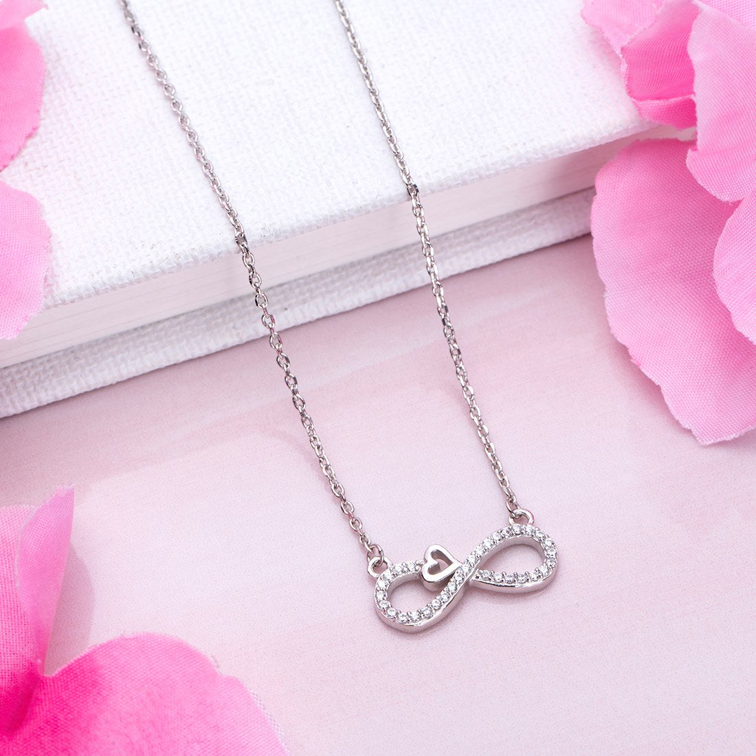 Product Description:- Embrace the eternal bond of love with our 'Infinite Love' necklace. Crafted from luxurious 925 sterling silver and adorned with a gleaming rhodium plating, this necklace features a delicate intertwining of infinity and heart motifs symbolizing everlasting affection. Sparkling cubic zirconia gemstones add a touch of brilliance, making it a perfect expression of timeless romance.