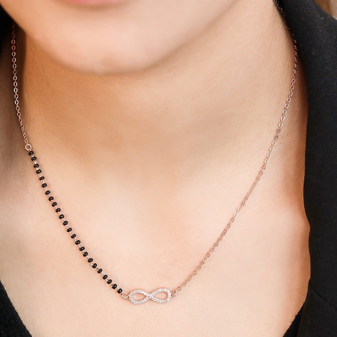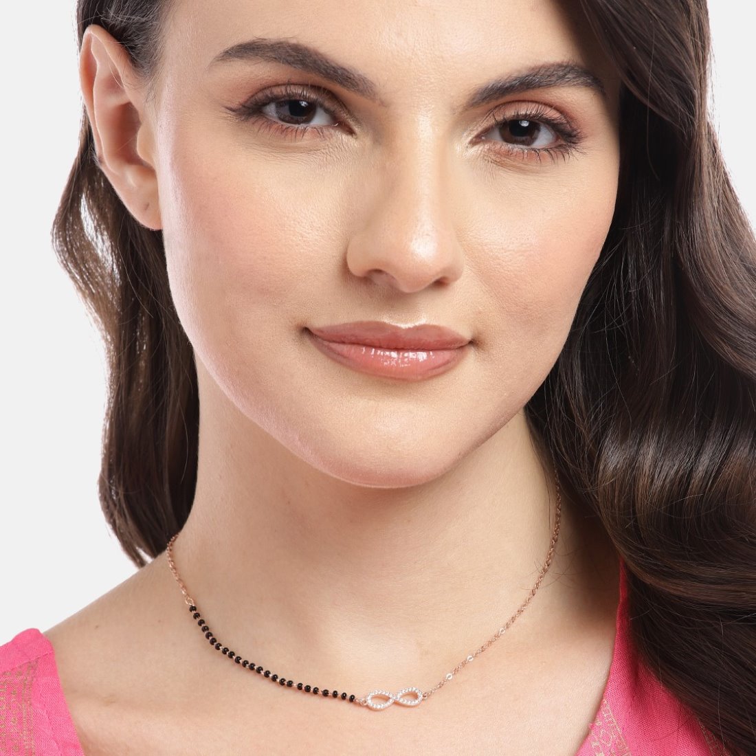 Product Description:- Celebrate eternal love and commitment with our Infinite Love mangalsutra. Crafted from lustrous 925 sterling silver and plated in captivating rose gold, it features an infinity pattern studded with sparkling cubic zirconia gemstones. This piece beautifully combines tradition with contemporary elegance, making it the perfect symbol of everlasting love. Wear it with pride and grace on your special day, and let its timeless design speak volumes about your enduring bond.
