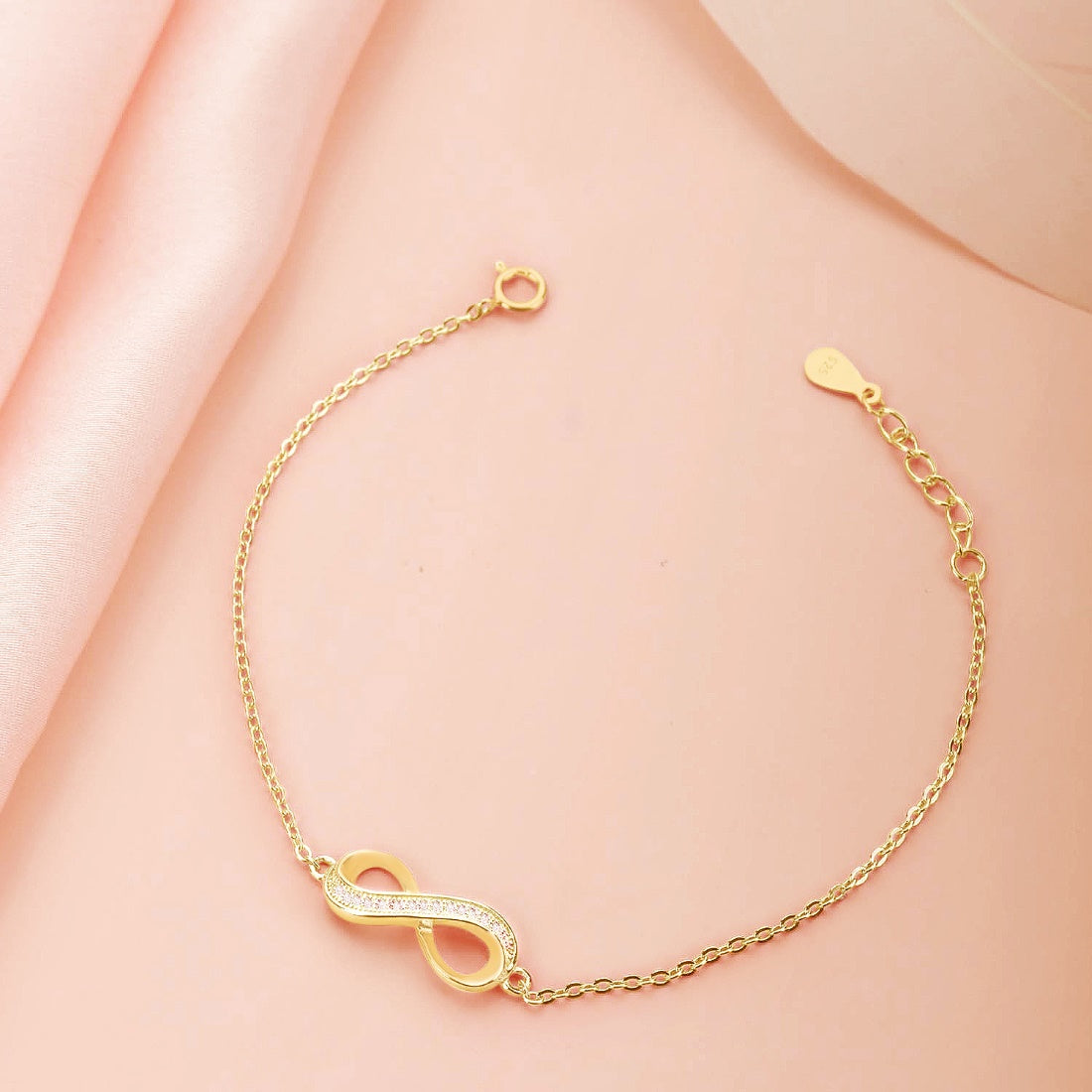 Product Description:- Elevate your style with our "Infinite Radiance" Gold-Plated 925 Sterling Silver Infinity Bracelet. This stunning piece effortlessly combines timeless elegance with modern design. The infinity symbol represents everlasting love and connection, making it a perfect accessory for any occasion. With its high-quality materials and expert craftsmanship, this anklet shines with radiance, adding a touch of luxury to your look. Whether worn on a casual day out or a special evening, it's a symbol of your endless style and grace.