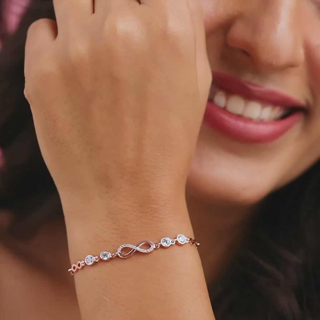 This stunning bracelet is crafted from 925 sterling silver, with a rose gold plating, and it's designed to symbolize the infinite and eternal nature of your love.