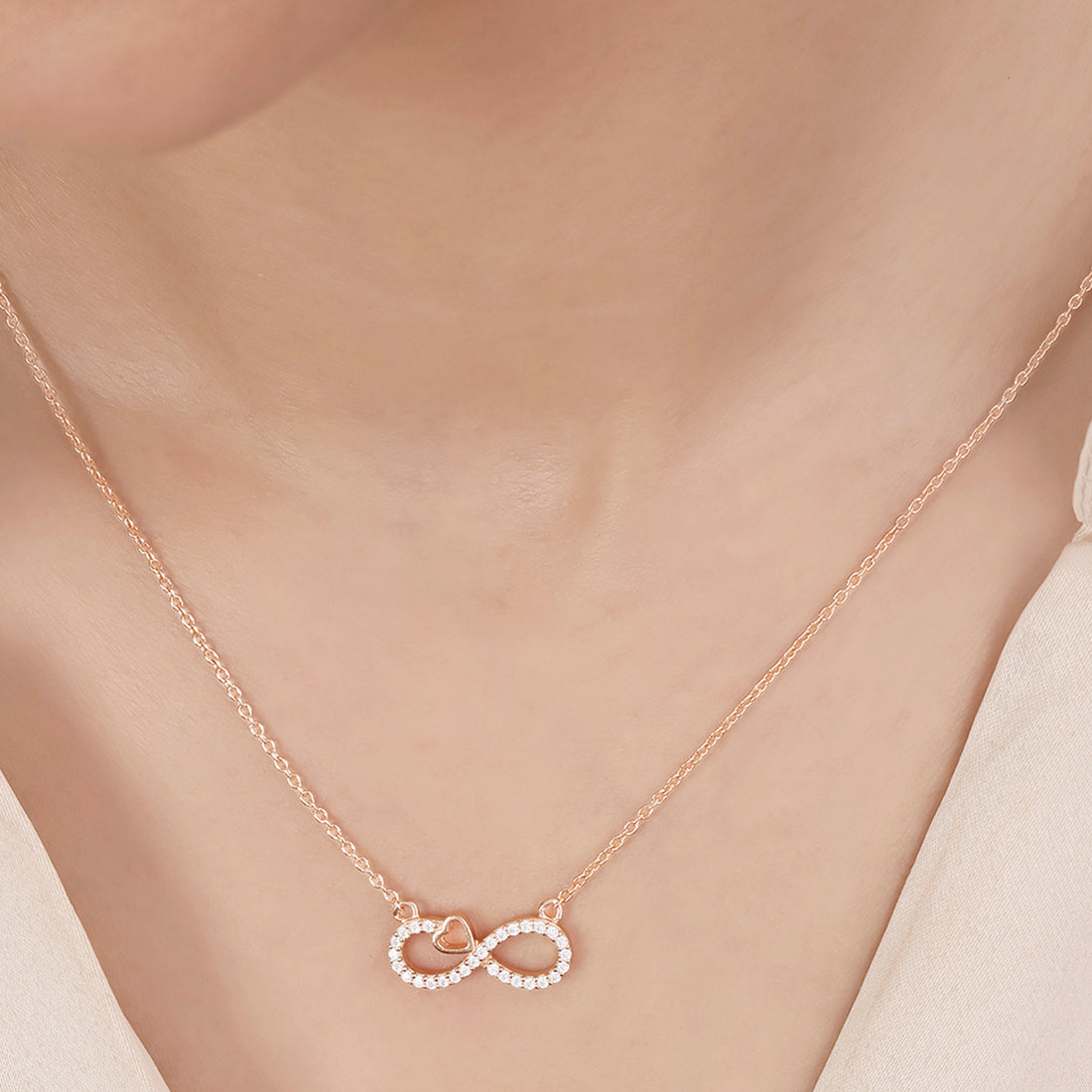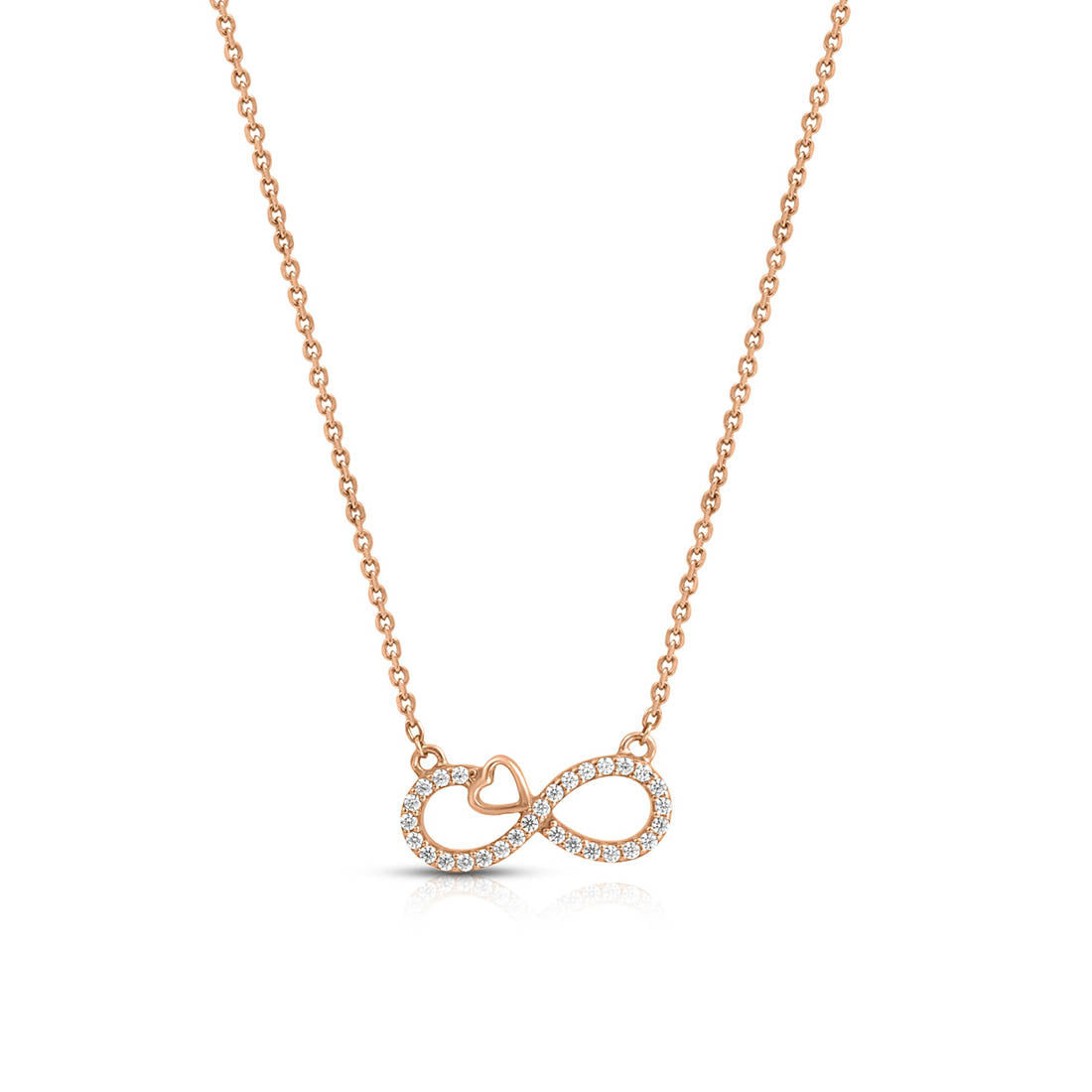 Product Description:- Crafted from premium 925 sterling silver with a lustrous rose gold plating, this necklace features a stunning infinity symbol, beautifully embellished with sparkling cubic zirconia stones. Representing endless love and unity, it makes a meaningful and elegant statement. Perfect for both everyday wear and special occasions, this necklace adds a refined touch of sophistication and warmth to any outfit, making it a timeless addition to your jewelry collection.