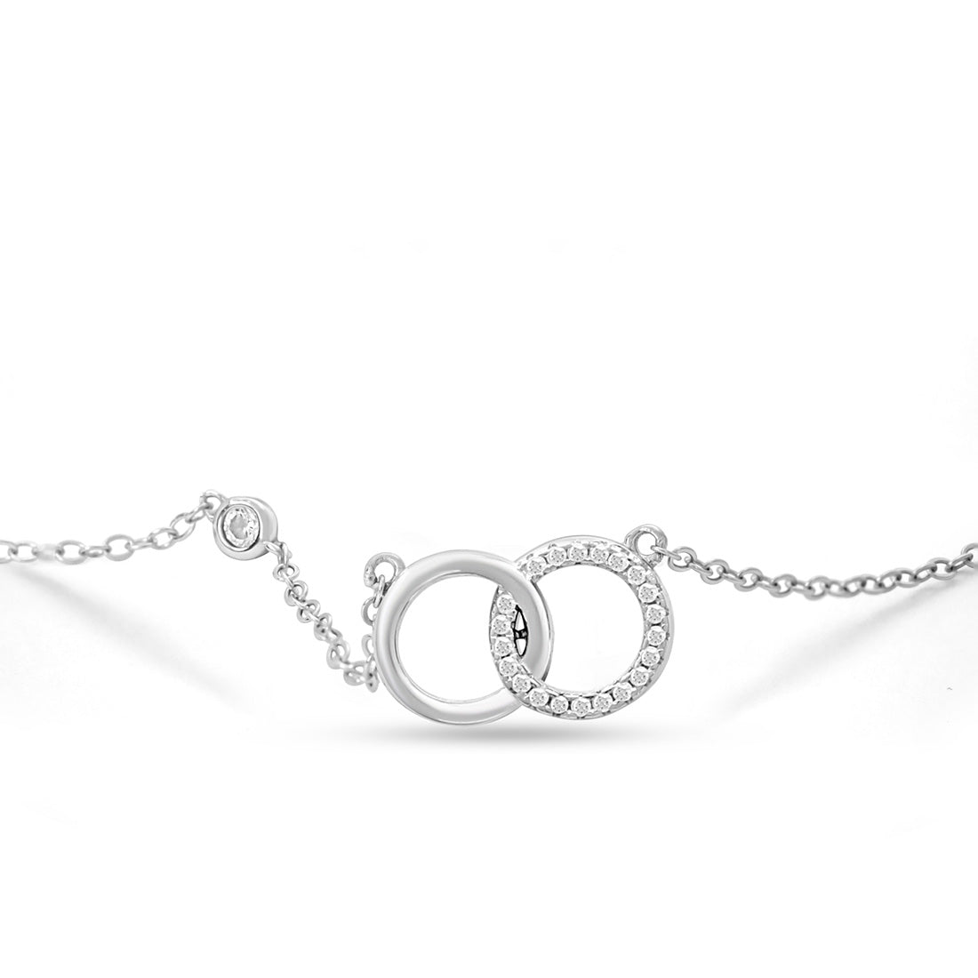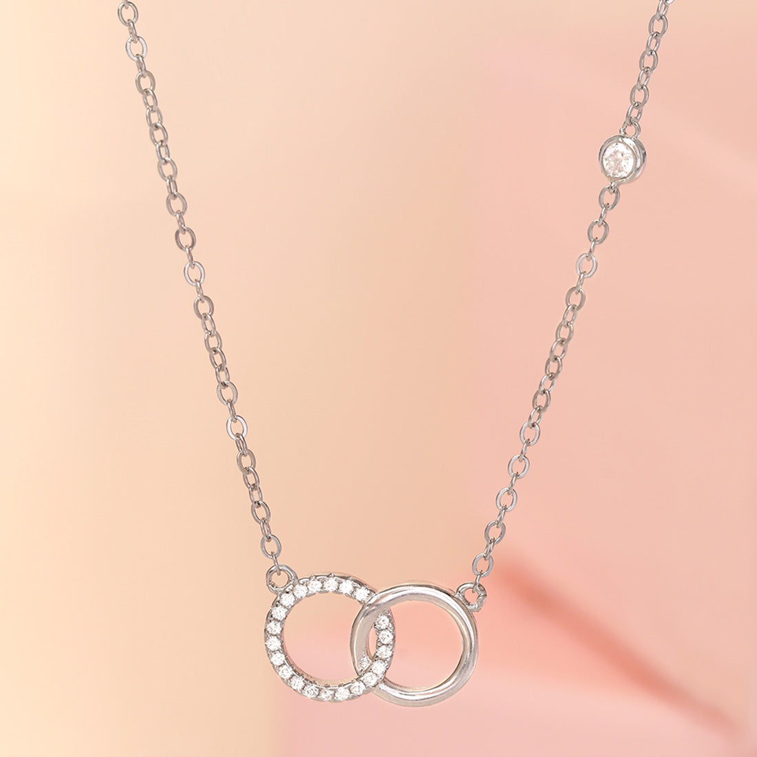 Product Description:- Crafted from 925 silver and plated with rhodium for a luxurious, tarnish-resistant finish, this elegant necklace showcases a delicate chain with a unique pendant of two interlinked circles. Symbolizing unity, connection, and eternity, the interlocking circles make this piece a meaningful gift for a loved one or a special occasion. Its simple yet sophisticated design ensures versatility, allowing it to complement any outfit effortlessly, whether for everyday wear or more formal settings.