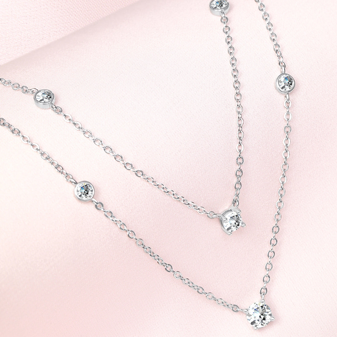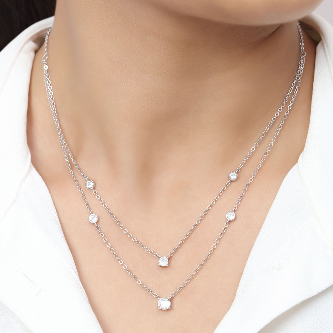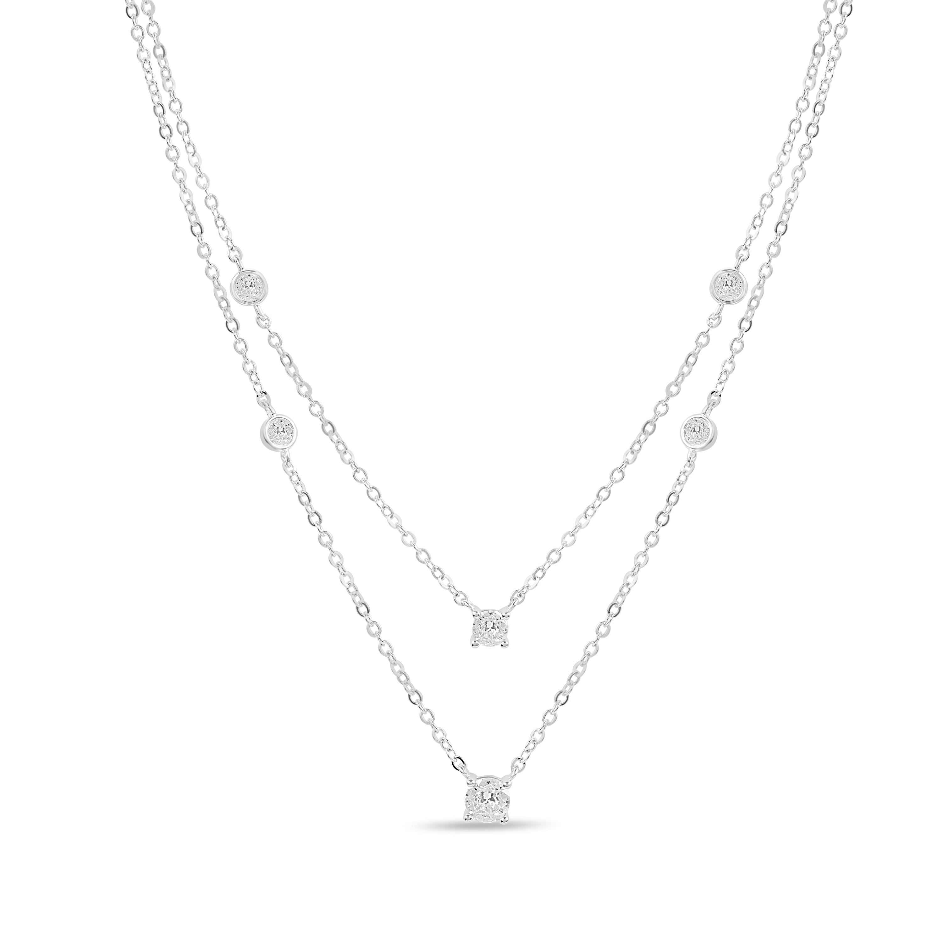 Product Description:- Crafted from premium 925 sterling silver with a sleek rhodium plating, this charm necklace showcases brilliant cubic zirconia stones. Inspired by the layered chain design, it offers a modern and elegant look. The combination of sparkling stones and polished metal creates a stunning piece that enhances any outfit. Versatile for daily wear or special occasions, making it a timeless addition to any collection.