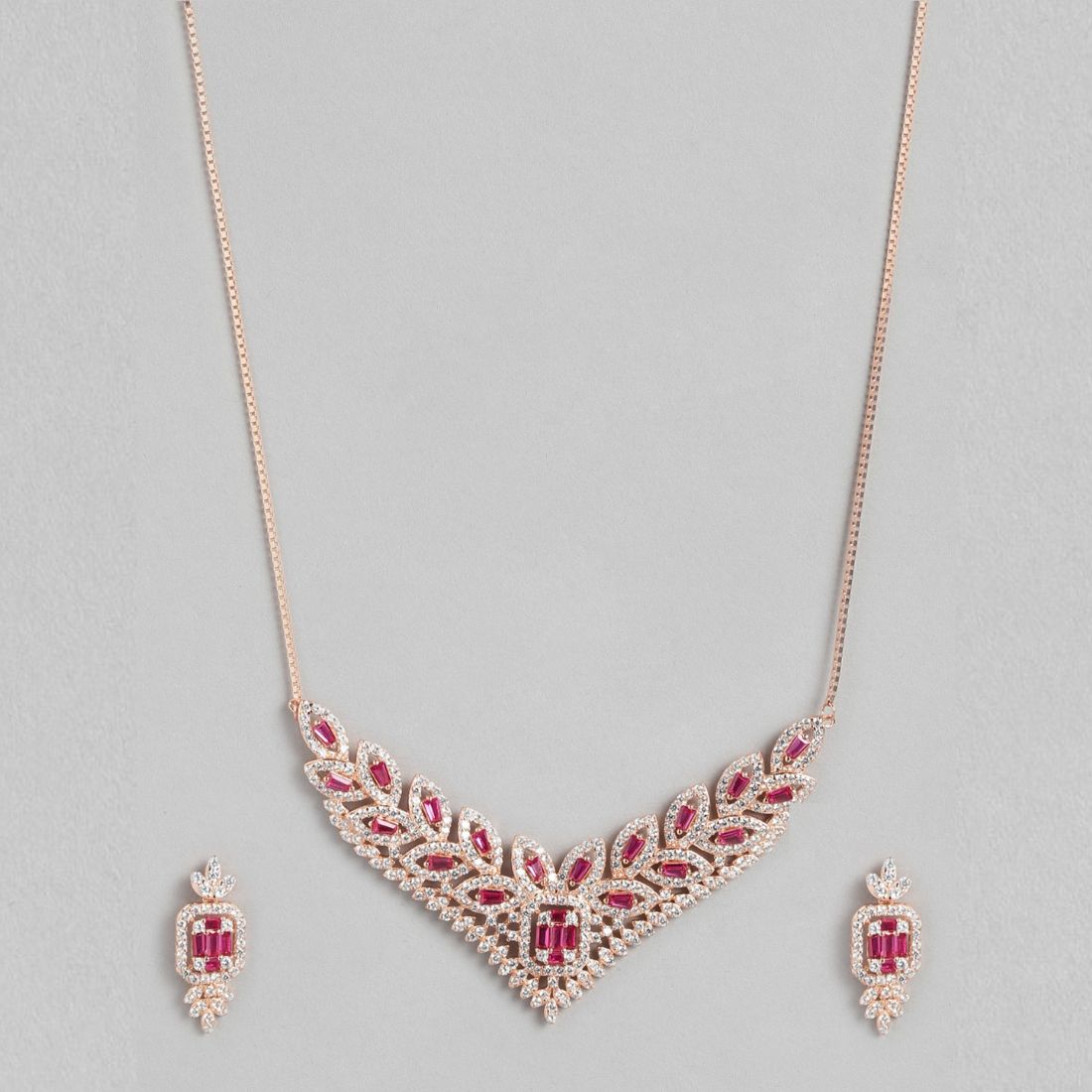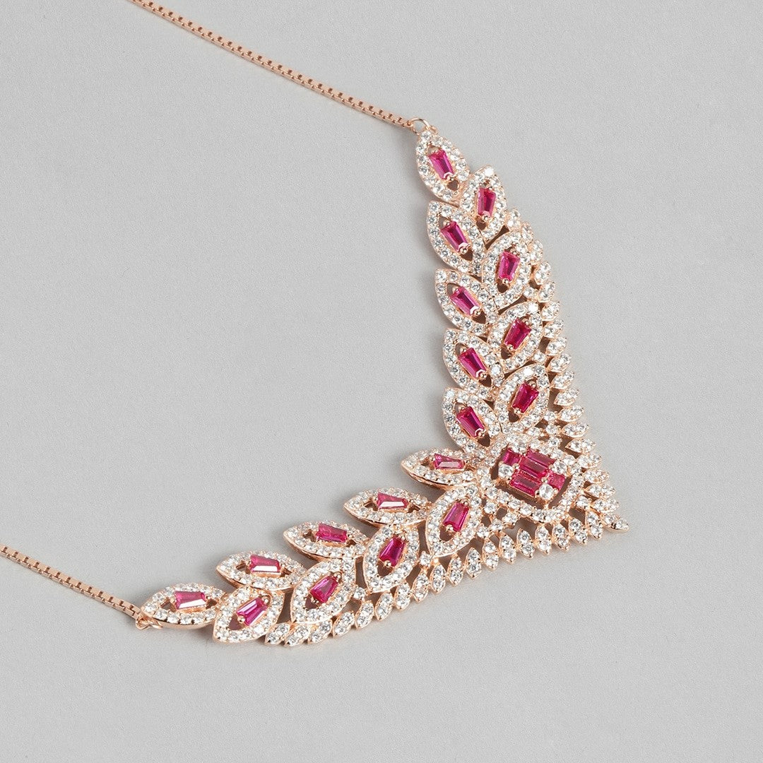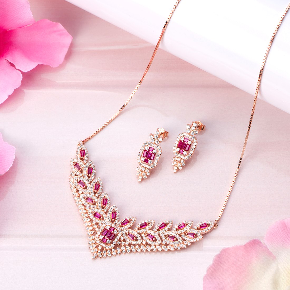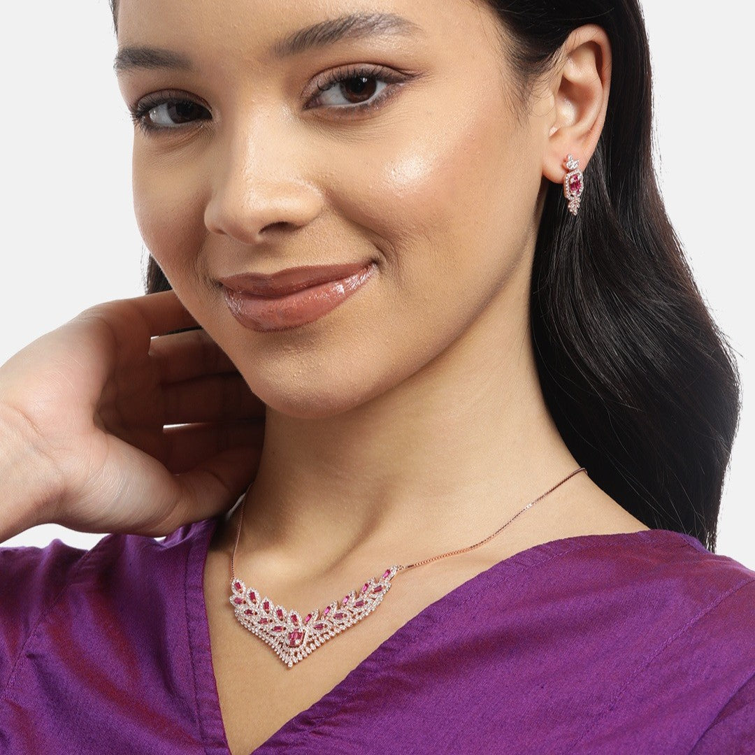 Product Description:- Adorn yourself with the natural elegance of our Leafy Radiance Harmony Jewelry Set. Crafted from high-quality 925 Sterling Silver and plated with the warm glow of rose gold, this set features a delicate leaf pattern embellished with the brilliance of Cubic Zirconia. The result is a captivating ensemble that seamlessly blends sophistication with nature-inspired allure, making it the perfect choice for adding a touch of refined glamour to any occasion.
