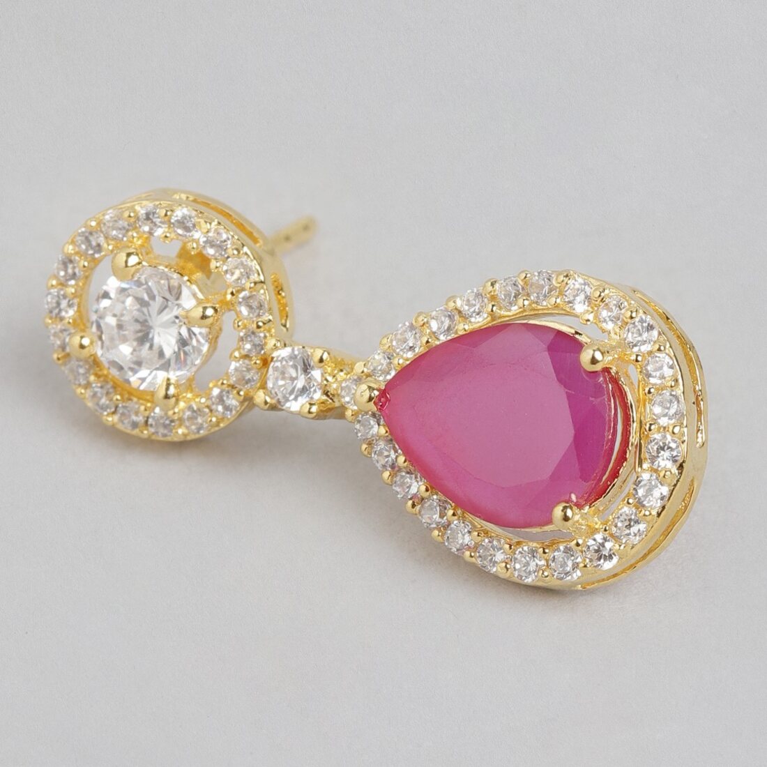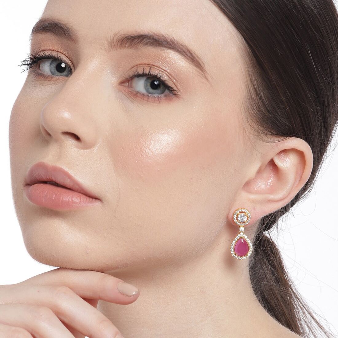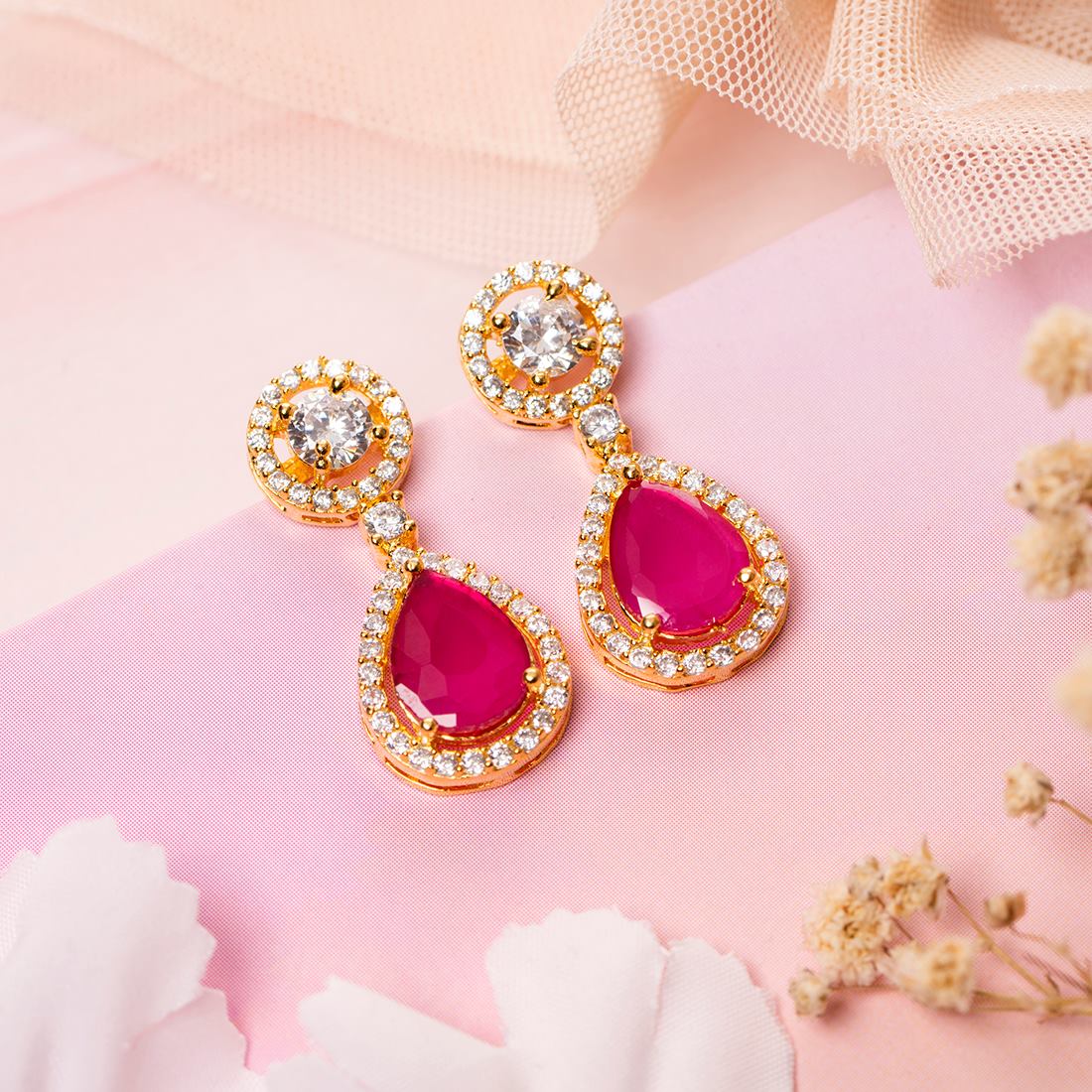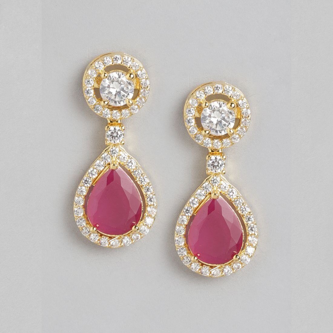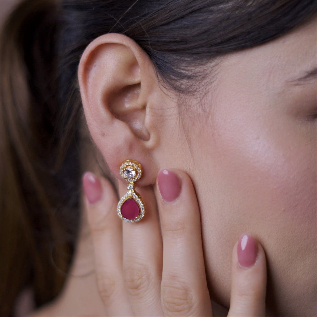 Product Description:- Elevate your style with our "Maroon Majesty" drop earrings. Crafted from high-quality 925 sterling silver and coated with a radiant gold plating, these earrings feature a stunning design with maroon and white cubic zirconia gemstones. Experience the regal beauty of these unique gold-plated earrings, adding a touch of sophistication to any outfit.