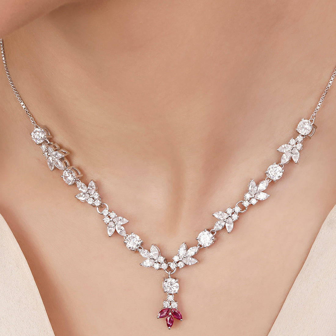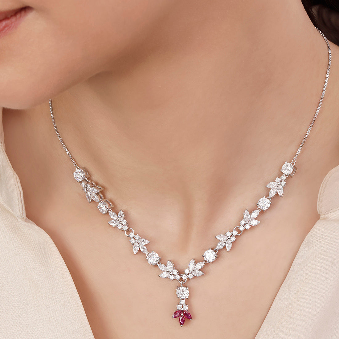 Product Description:- Crafted from premium 925 sterling silver and finished with a radiant rhodium plating, the Midnight Reverie necklace exudes elegance and charm. Featuring dazzling cubic zirconia accents, it captures the allure of a starlit night. This necklace is perfect for elevating your style, whether for everyday wear or special occasions. A symbol of timeless beauty, it is a must-have addition to any jewelry collection.